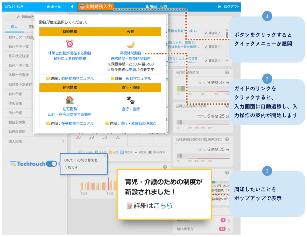 ノーコードで迅速な運用改善:システム本体を改修することなく、ノーコードで画面誘導やガイドを提供できます。人事システムに求められる企業ごとの申請・勤怠管理ルールへの迅速な運用改善を支援し、従業員が迷わず操作できる環境を整えることで、問い合わせ負荷の軽減にも寄与します。