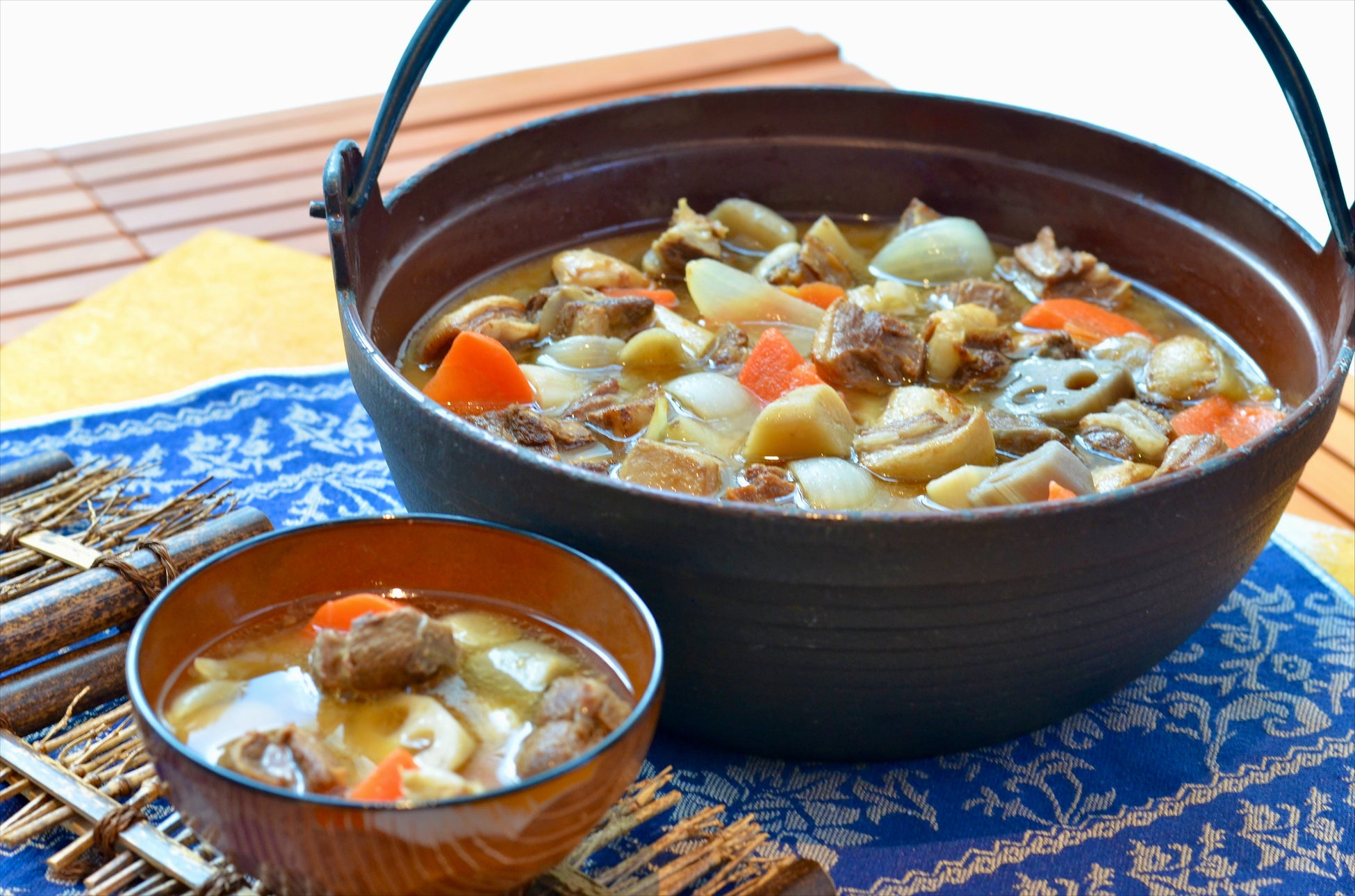 具材は、玉ねぎ、人参、大根、ごぼう、れんこんの根菜類を使用し、食べやすいように現代風にアレンジして、昆布とかつおの出汁に、隠し味にしょうがを加え、すっきりとしたみそ味に仕上げました。