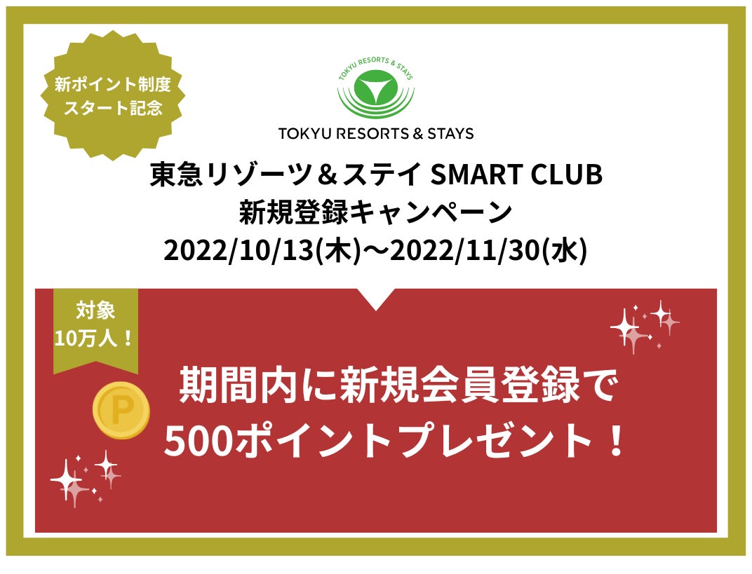 東急リゾーツ&ステイSMART CLUBのスタートを記念し、2022年11月30日(水)までに新規会員登録いただいたお客様先着10万人に500ポイントを進呈いたします。ポイントは、期間限定ポイントとなり、2023年3月31日(金)まで公式予約サイト、公式予約アプリからの施設予約時にご利用いただけます。是非、この機会に東急リゾーツ&ステイSMART CLUBにご登録下さい。