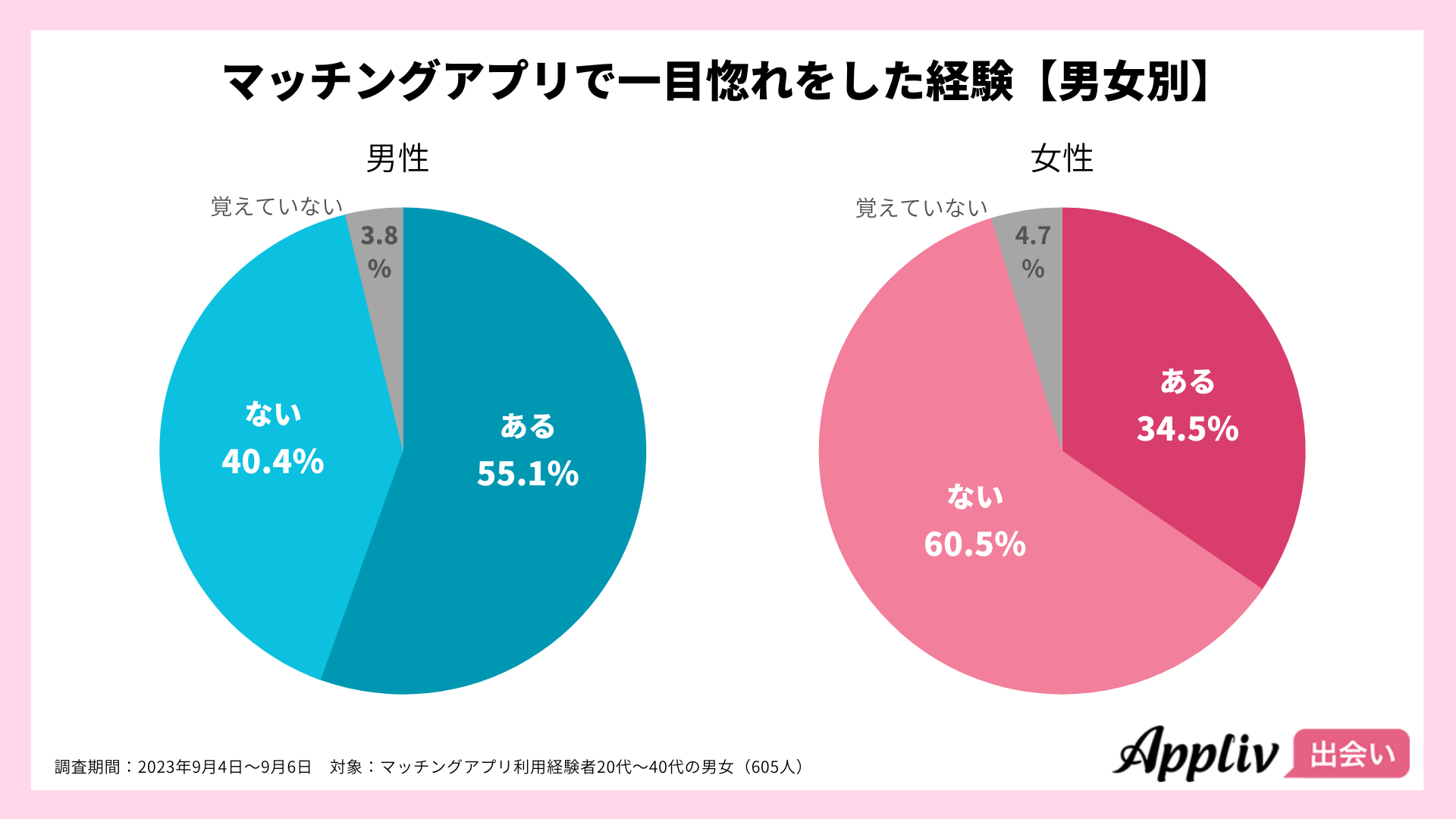 約半数の人がマッチングアプリで一目惚れした経験有り、男性の方が高い傾向