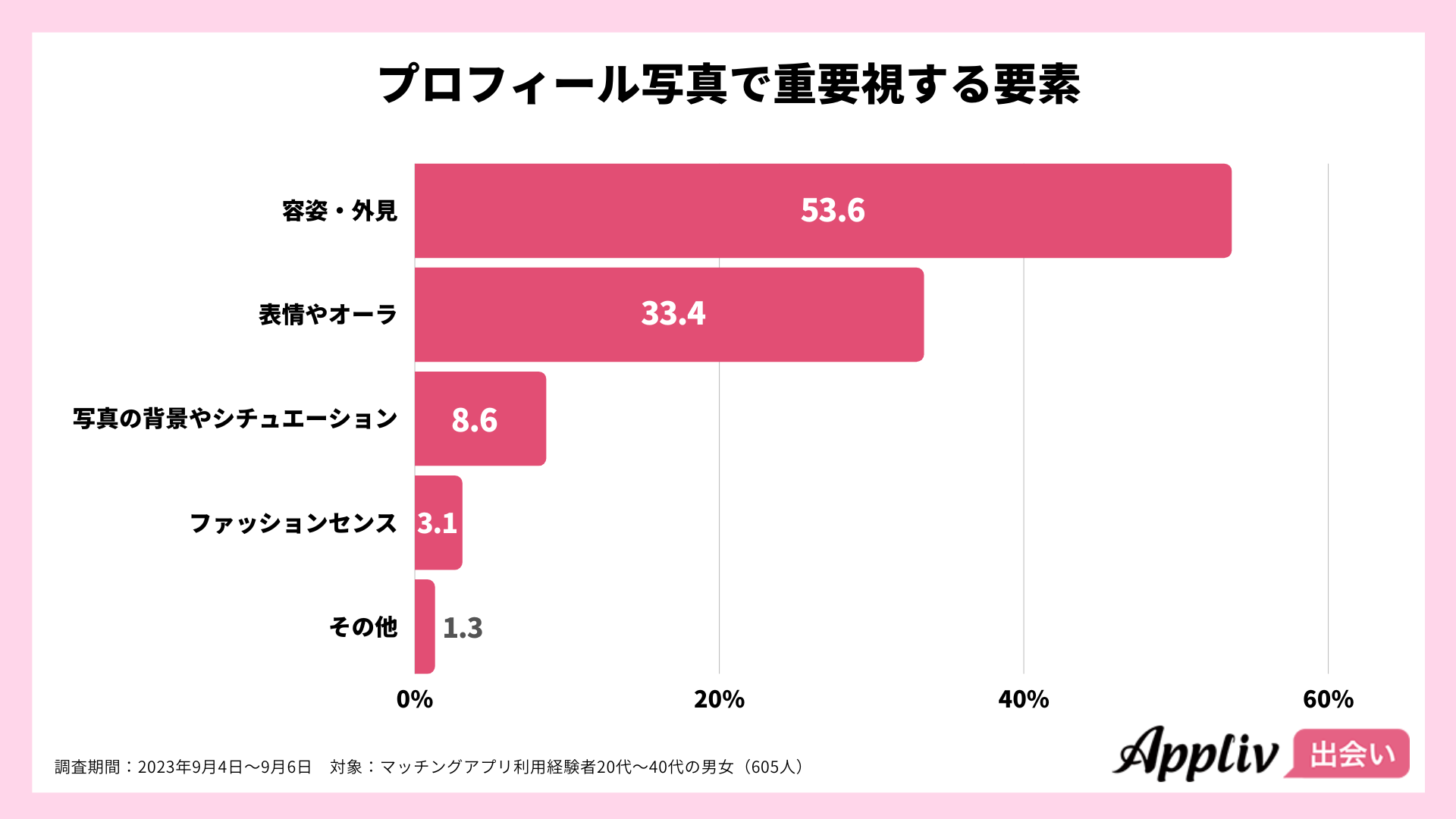 相手のプロフィール写真において、最も重要視する要素を聞いたところ、最多は「容姿・外見(53.6%)」、次いで「表情やオーラ(33.4%)」、「写真の背景やシチュエーション(8.6%)」でした。