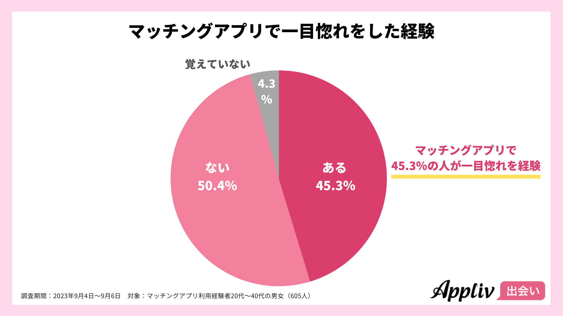 マッチングアプリで一目惚れをしたことがあるか尋ねたところ、「ある」が45.3%、「ない」が50.4%でした。