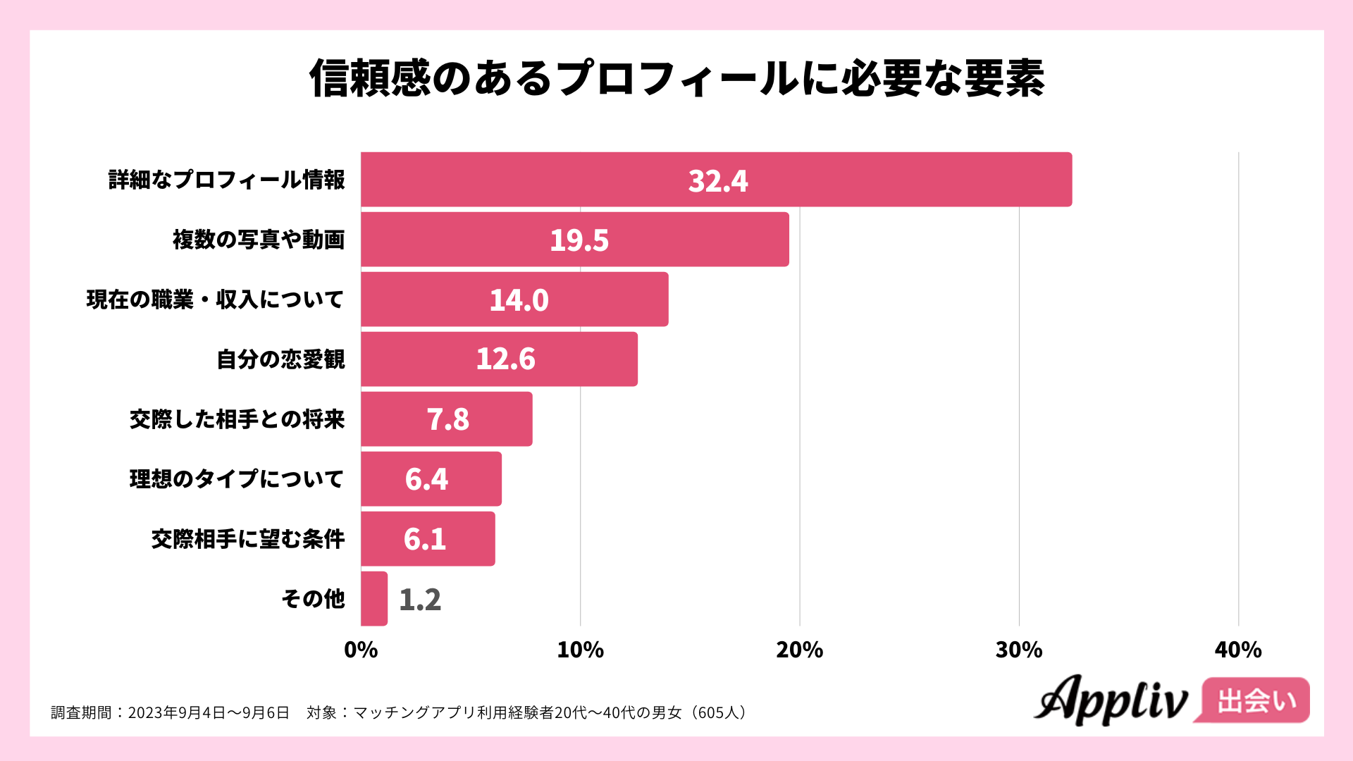 最後に、マッチングアプリ上で信頼を感じられる人について尋ねてみた結果、最も多かったのは「詳細なプロフィール情報(32.4%)」、次いで「複数の写真や動画(19.5%)」、「現在の職業・収入について(14.0%)」の順でした。
