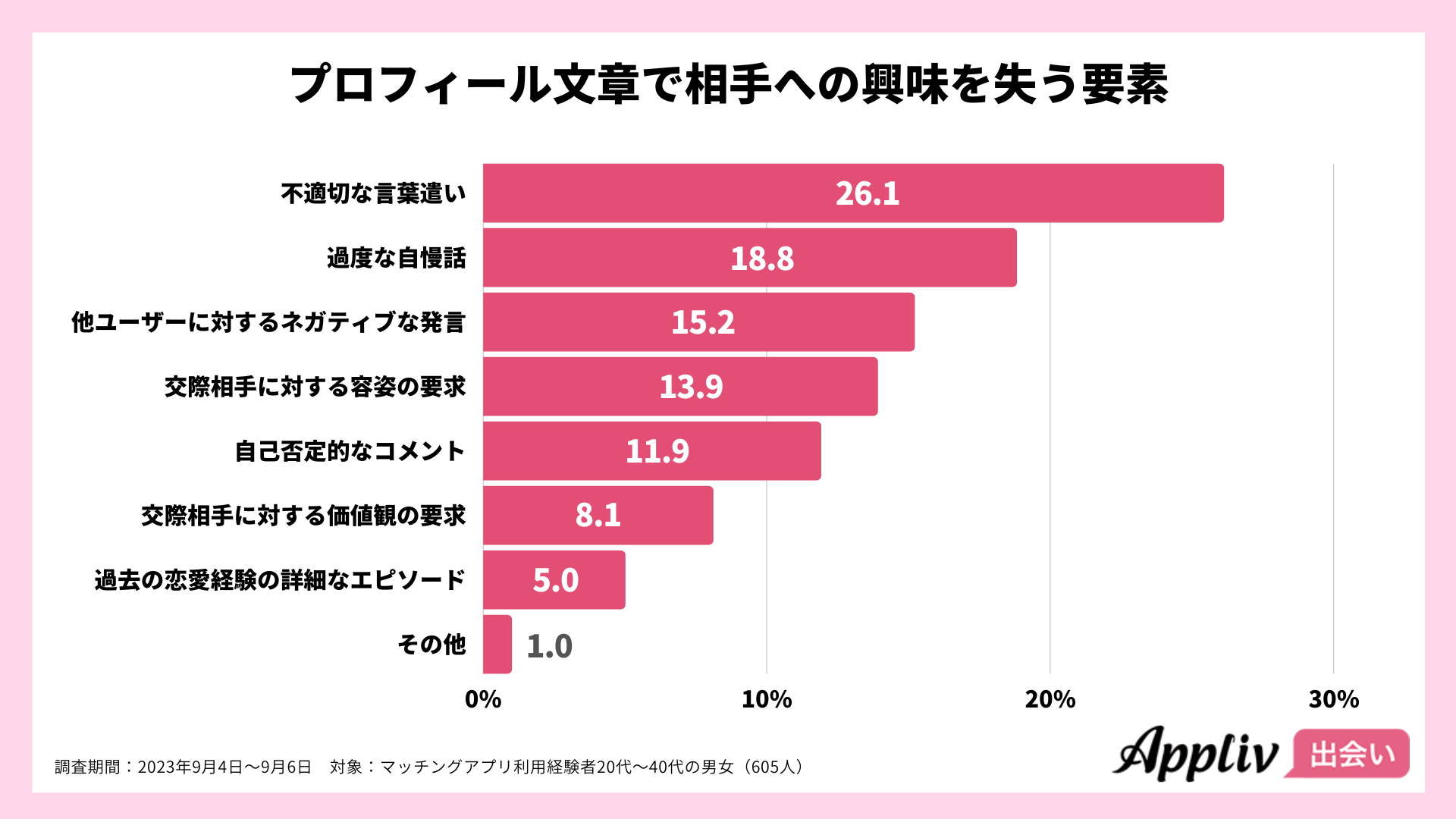 プロフィール文章を読んだ際に、相手への興味を失う要素を調べてみると、1位は「不適切な言葉遣い(26.1%)」、2位は「過度な自慢話(18.8%)」、3位は「他のユーザーに対するネガティブな発言(15.2%)」という結果でした。