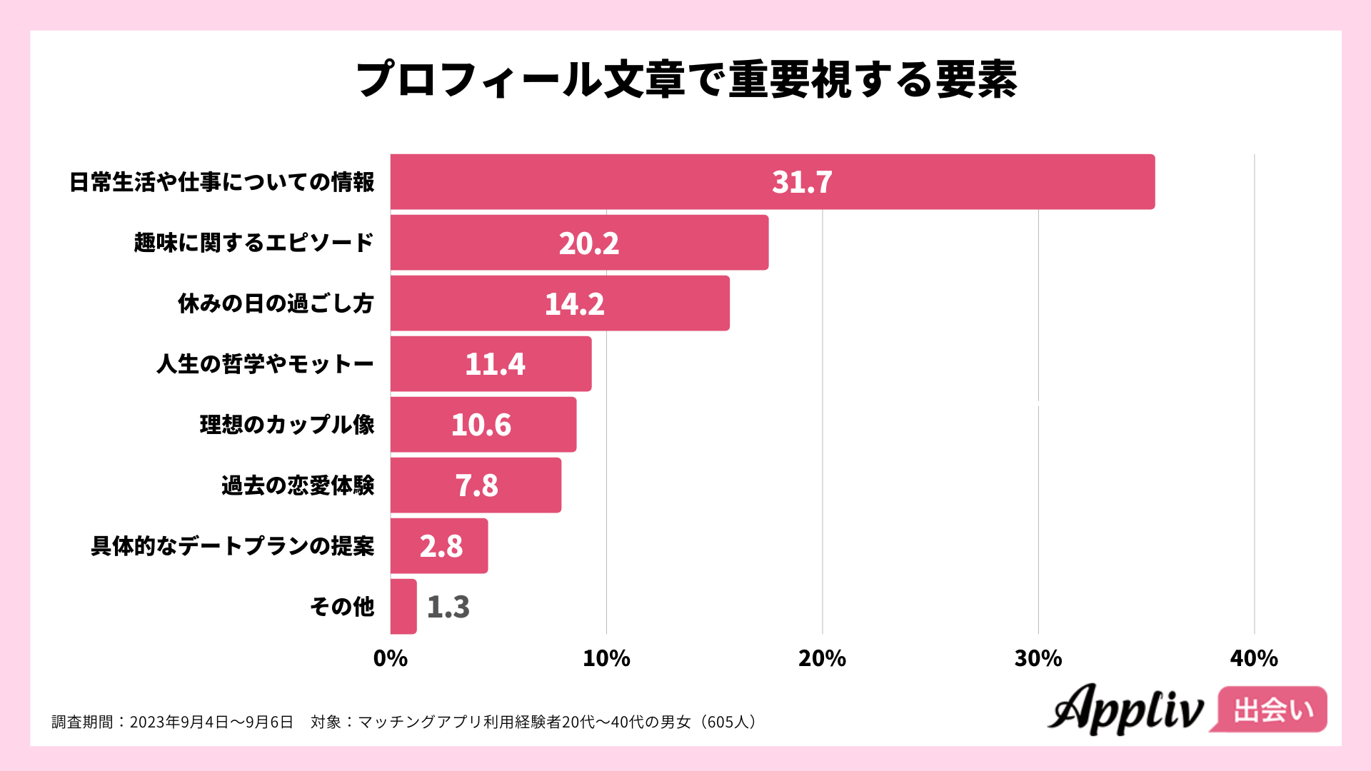 プロフィール文章を読んだ際に、最も興味を引かれる内容を尋ねてみると、「日常生活や仕事についての情報(31.7%)」が最も多く、次いで「趣味に関するエピソード(20.2%)」、「休みの日の過ごし方(14.2%)」という結果でした。