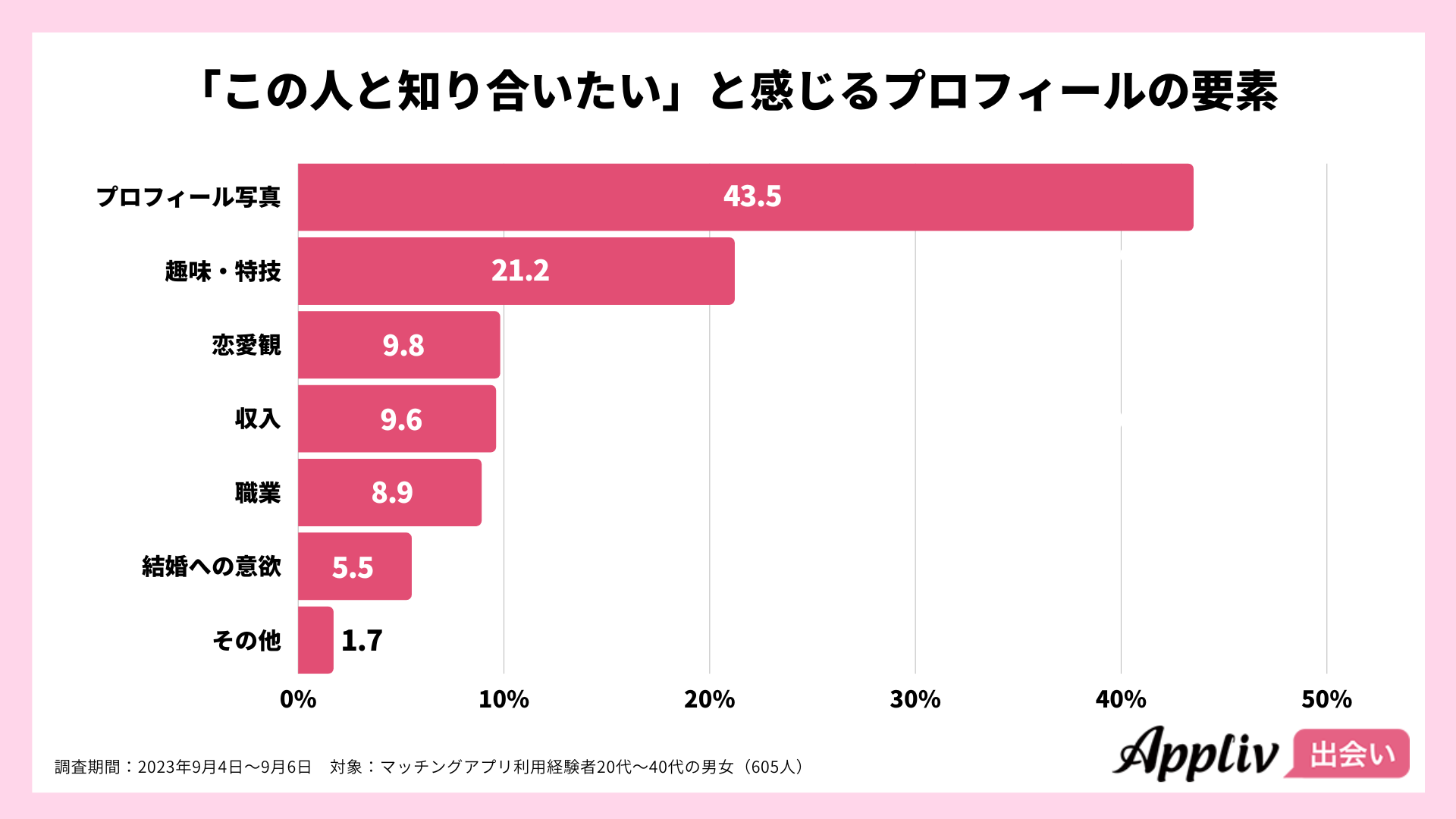 ナイル株式会社(本社:東京都品川区、 代表取締役社長:高橋飛翔、 以下ナイル)が運営する恋愛・婚活メディア「Appliv出会い」にて、 2023年9月4日から9月6日の期間、 20~40代のマッチングアプリの利用経験がある男女608人を対象に、アプリから得る情報に関するアンケート調査を実施いたしました。