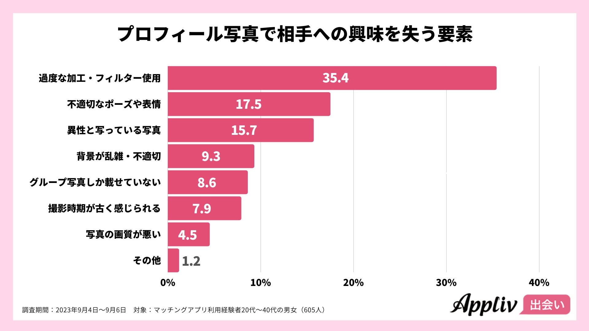 プロフィール写真を見た際、相手への興味を失う要素について聞いた結果、最も回答が多かったのは「過度な加工・フィルター使用(35.4%)」でした。次いで「不適切なポーズや表情(17.5%)」、「異性と写っている写真(15.7%)」となっています。