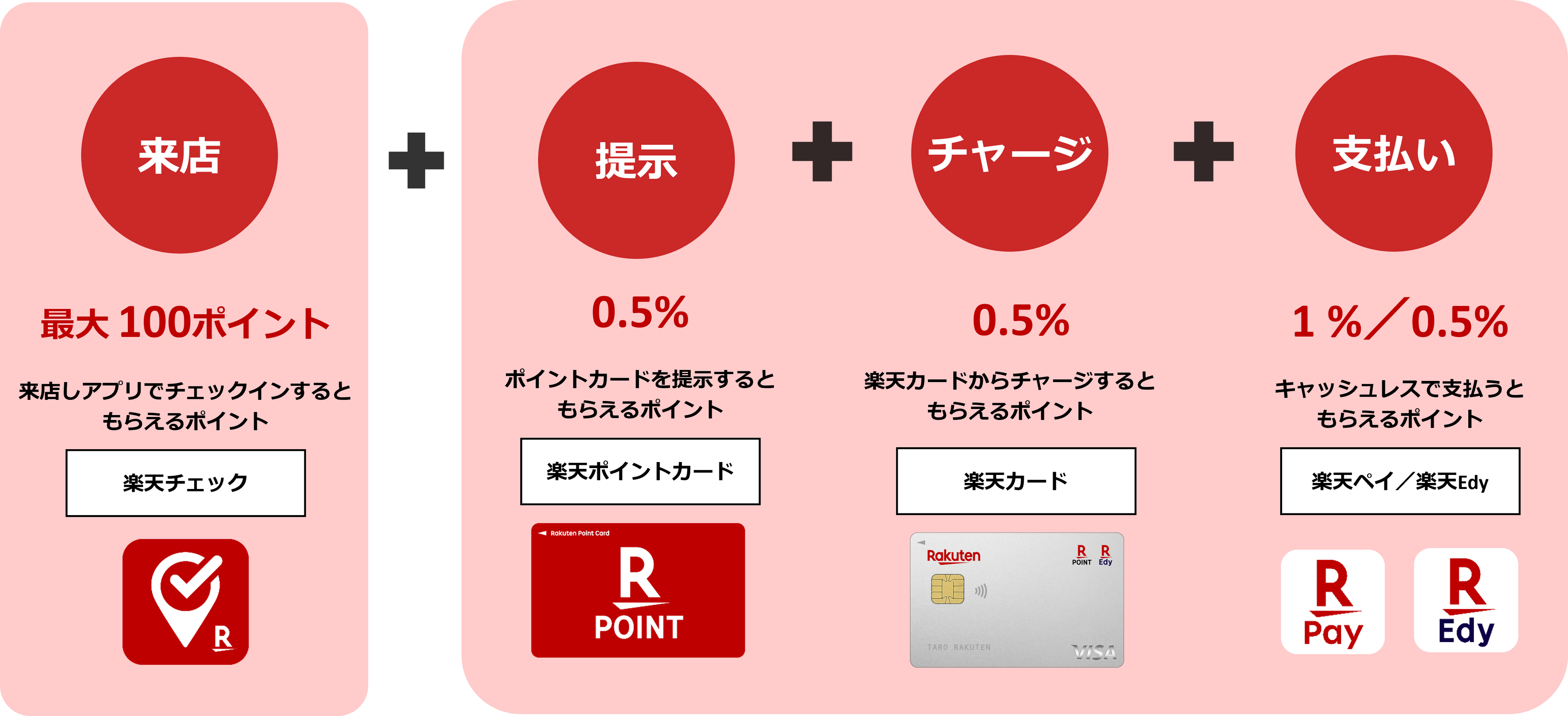 既に導入済みの「楽天ペイ(アプリ決済)」「楽天ポイントカード」「楽天Edy」と、このたび利用可能となる「楽天チェック」を組み合わせると、「楽天ポイント」の最大四重取りが可能となります(注2)。