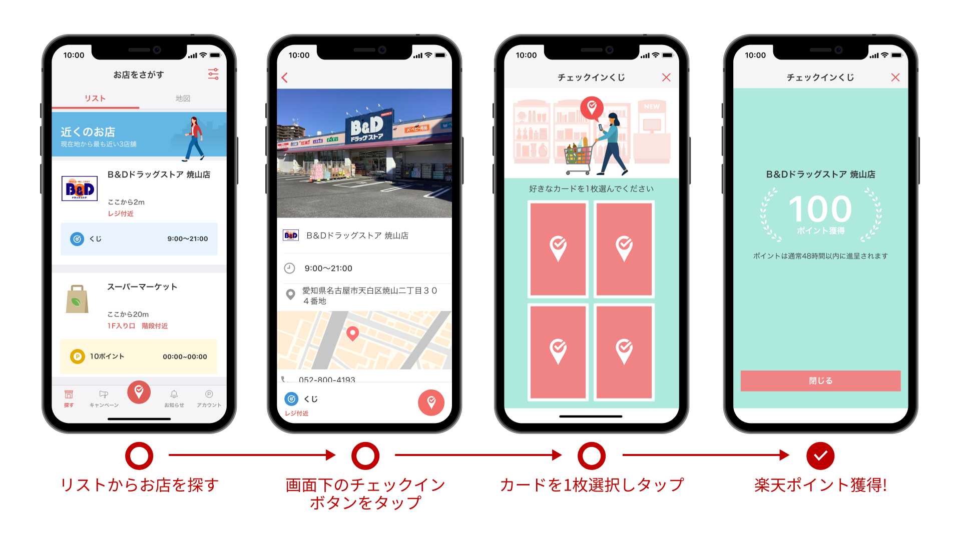 これにより、利用者は店内の指定エリアで「楽天チェック」アプリを起動しチェックインすると、くじ形式で「楽天ポイント」を最大100ポイント獲得することができるようになります。