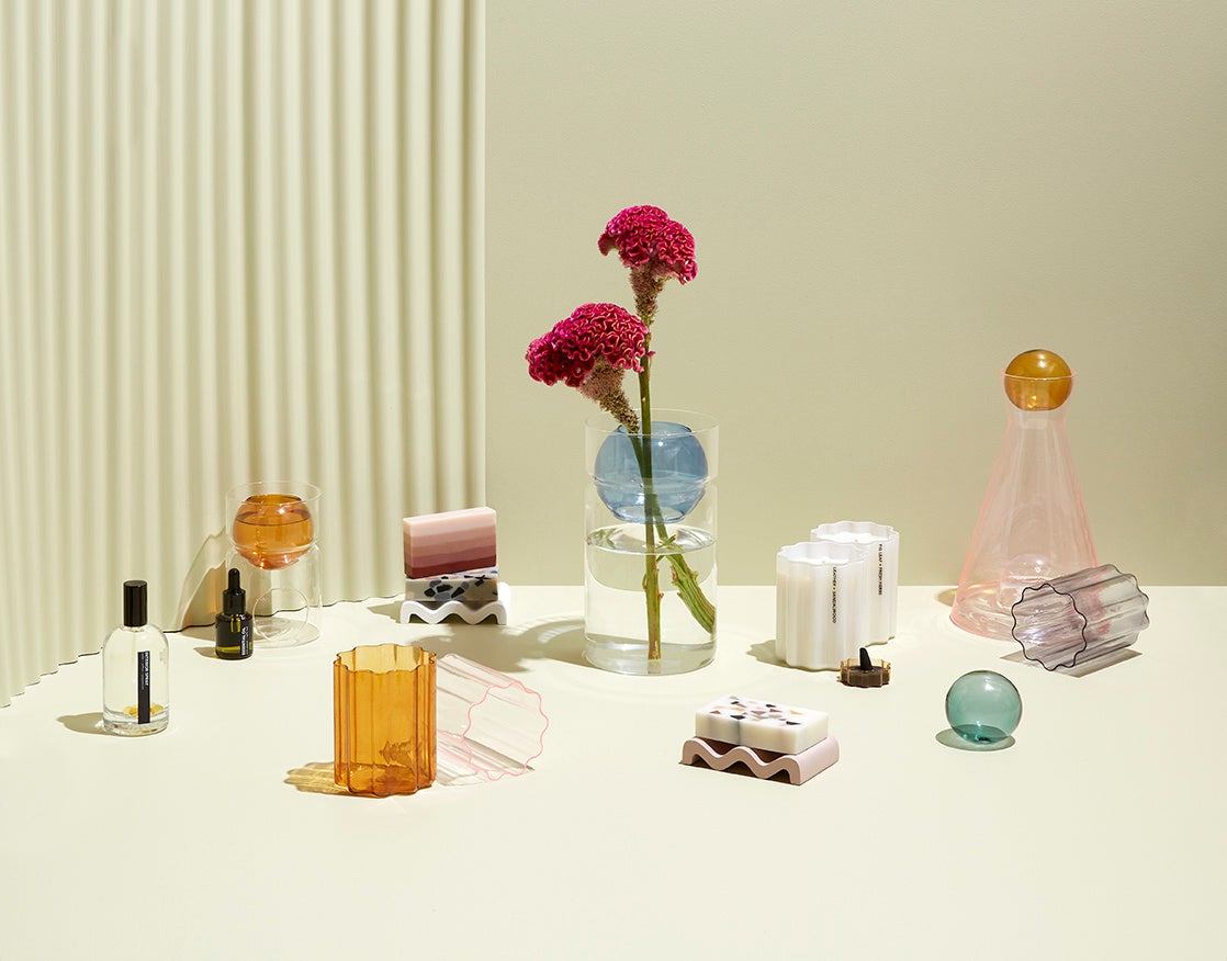 「視線よりも少しひくい」と題した本展示は、誰もいない時間の生活や人の気配を感じる部屋がコンセプトになっています。このコンセプトのもと、美しい曲線と心地よい色合いのグラデーションで制作された描きおろし原画やリソグラフ、グッズ、そしてmillitsukaの作品の世界観に合わせ、セレクトした雑貨ブランドの商品も並びます。
