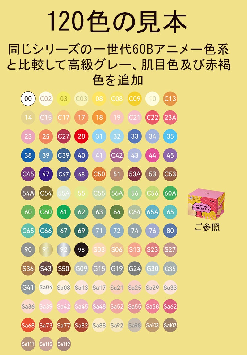 一世代60Bアニメー色系と比較して高級グレー、肌目色、赤褐色を追加します。人気商品として片端やわらしいペン先付きの白い棒タイプはよく売れています。今回アニメー色系120色を開発しました、それで、アニメーだけではなく、服装設計、建築設計、スライスなどの場所に応用されます。