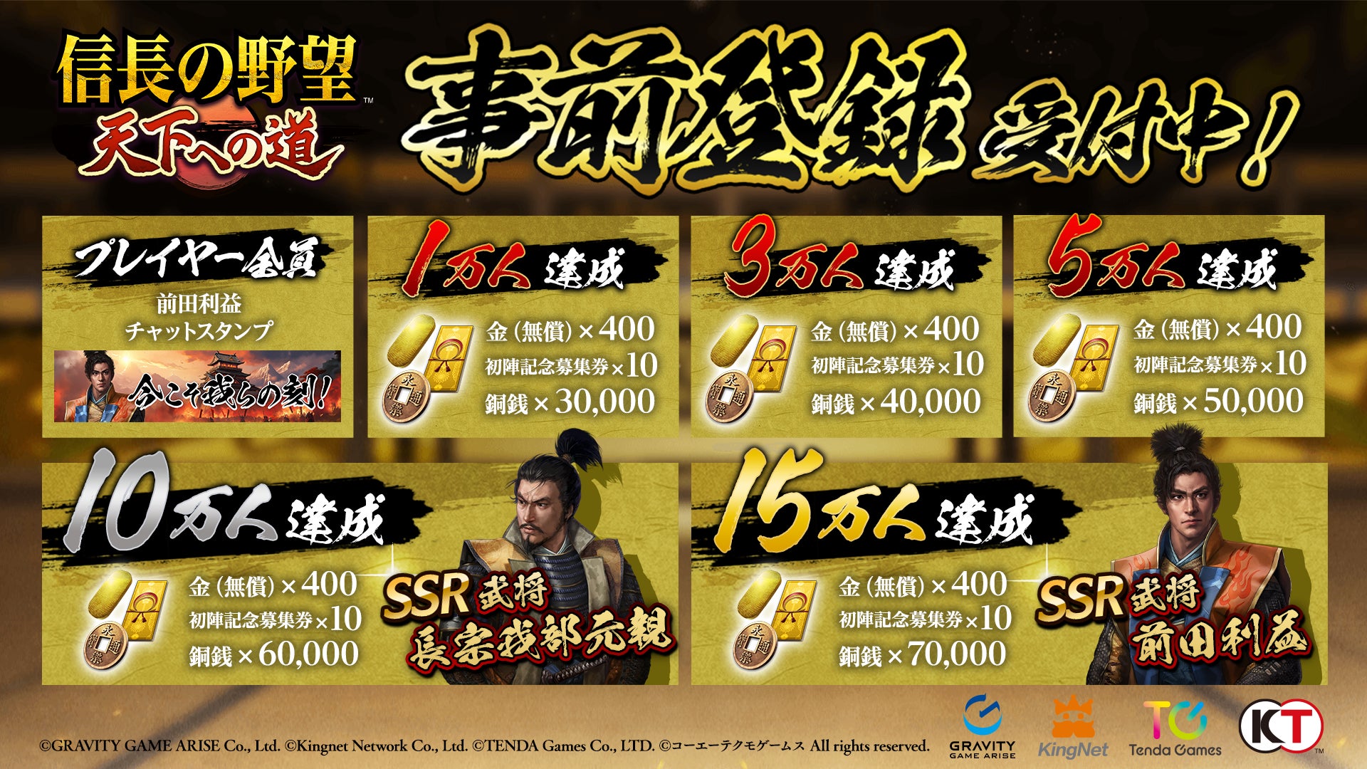 事前登録者数に応じて、ゲーム内通貨である「金(無償)」や武将募集が出来る「初陣記念募集券」が獲得できるほか、15万人達成時にはSSR武将である「前田利益」をお客様全員にプレゼントいたします!