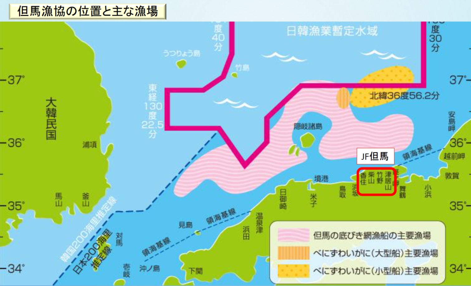 海老は沖合底曳網漁法で水揚げされ、操業期間は9月~翌年5月(11/6~3/20は松葉蟹)。但馬の各漁港合わせて現在37隻(35~144トン)と漁船の多さが漁獲量を牽引します。