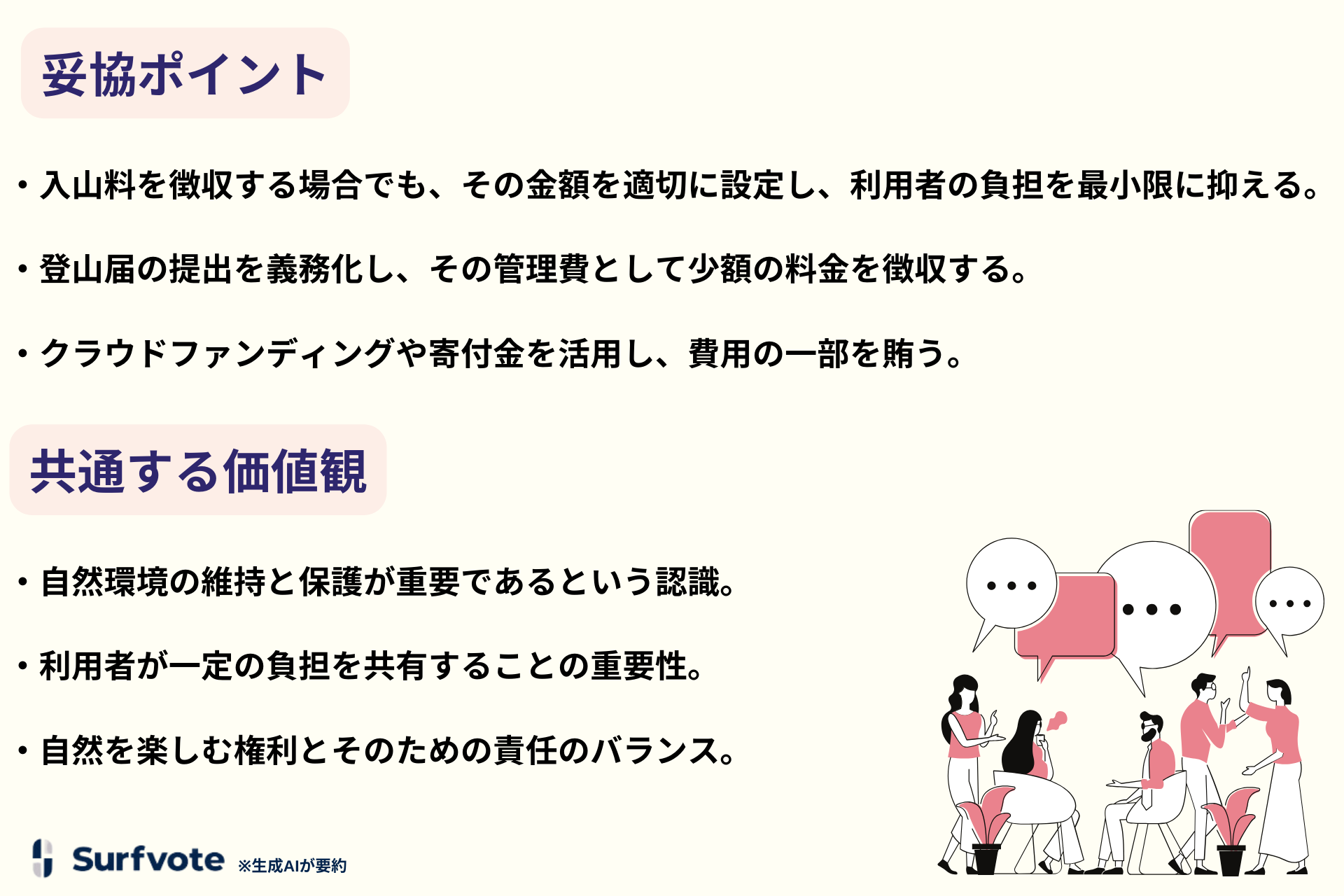 各選択肢を選んだ人の意見から、妥協ポイントと共通する価値観を提案(生成AIが要約)