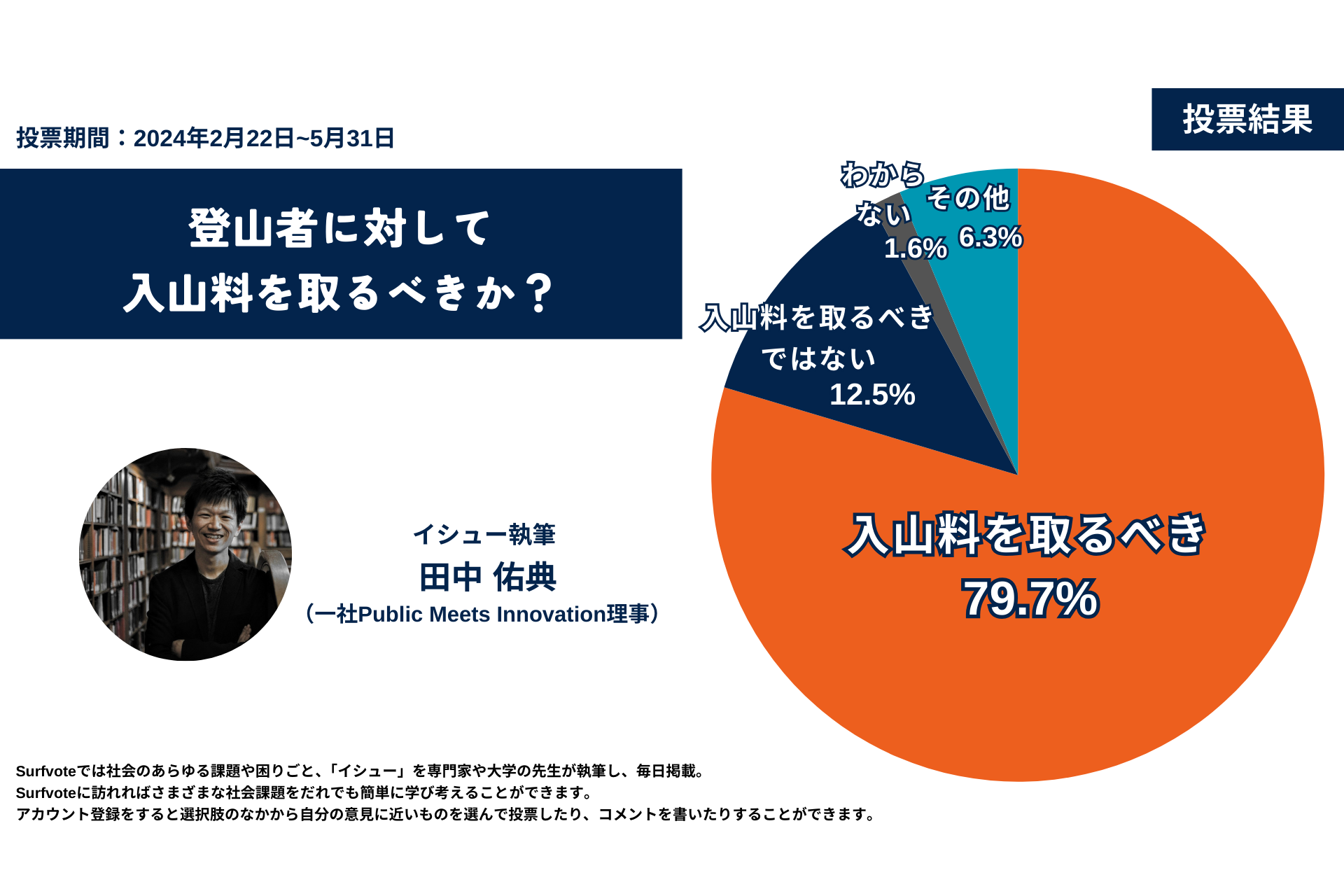一般社団法人Public Meets Innovation理事を務める田中佑典さんがSurfvoteで「入山料」について課題提起。「持続可能な登山」についてさまざまな視点から意見が集まりました。