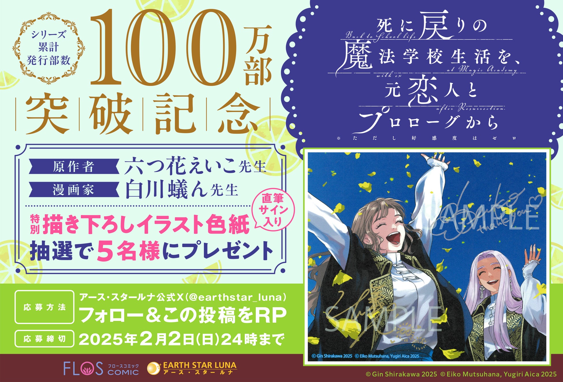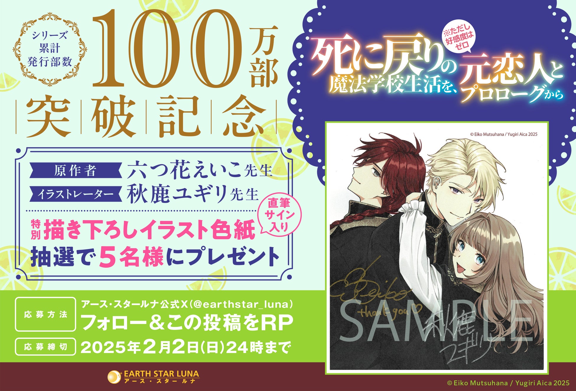 株式会社アース・スター エンターテイメント(東京都・品川区)が【アース・スタールナ】で原作ノベルを刊行し、株式会社KADOKAWA(東京都・千代田区)が【FLOS COMIC(フロースコミック)】でコミカライズを刊行する人気作品『死に戻りの魔法学校生活を、元恋人とプロローグから(※ただし好感度はゼロ)』が、シリーズ累計100万部を突破いたしました。こちらを記念して、プレゼント企画満載のお祝い特設サイトを、本日1月27日(月)より公開しております。
