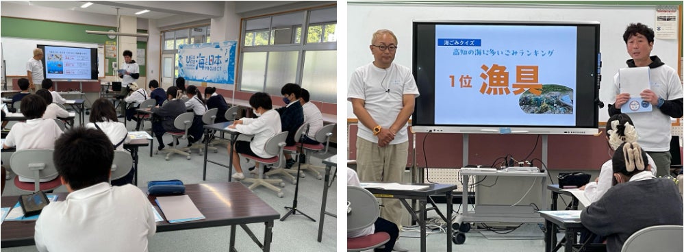 授業は、お笑いコンビのツーライスによる海洋ごみ問題の解説から始まりました。ごみの約8割が私たちが暮らす町で発生し、川を経て海に流れ着いたプラスチックが主であることをユーモラスに伝えながらも、海の生き物に与える深刻な影響を指摘。特に高知の海に多いごみとして「漁具」が上位を占めるなど、地域特有の課題にも触れ、日々の生活におけるごみの適切な処理の重要性を訴えました。