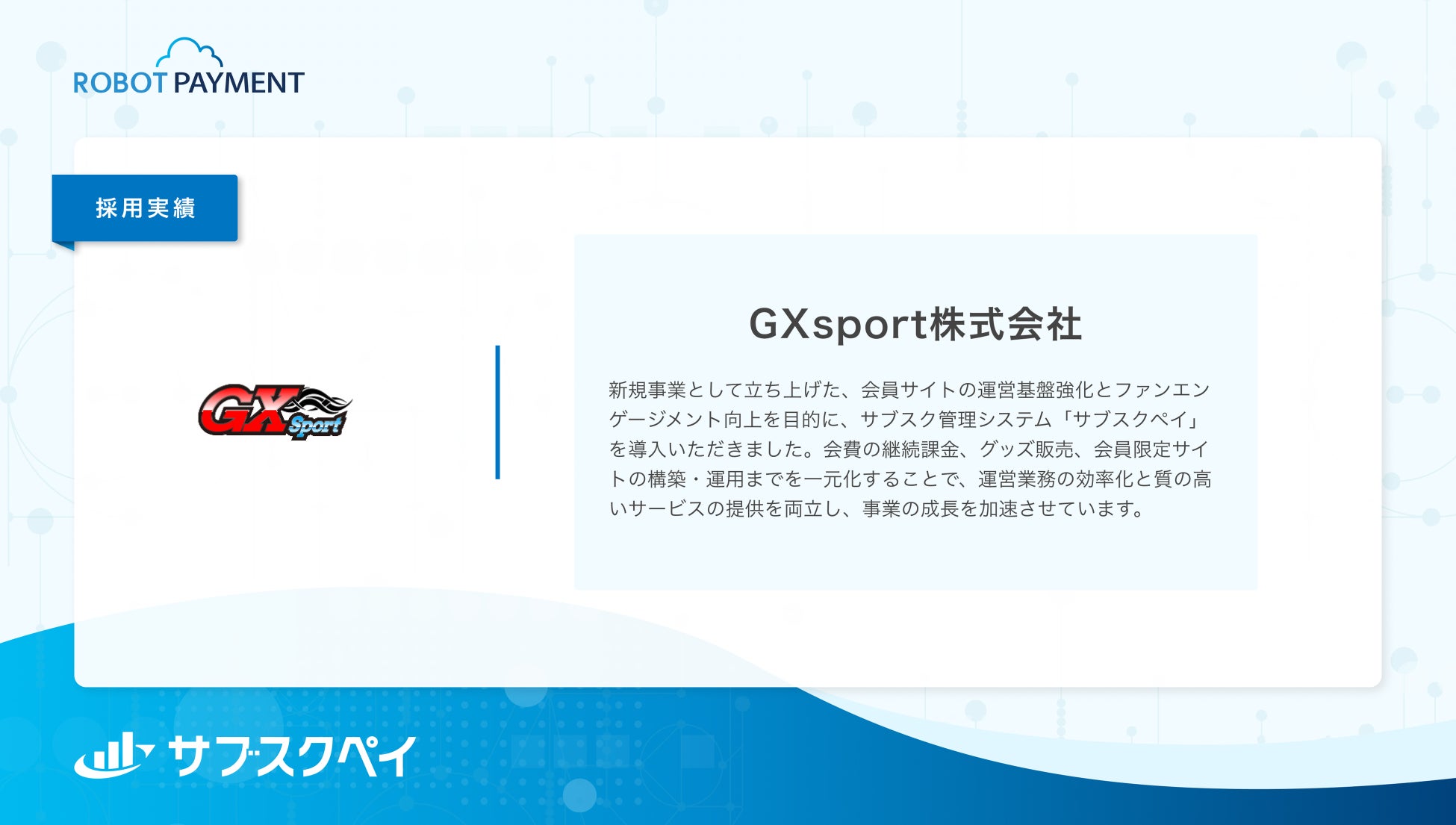 企業のお金の流れを円滑にし、新たな価値創造を促進する株式会社ROBOT PAYMENT(本社:東京都渋谷区、代表取締役執行役員CEO:清久 健也、証券コード:4374、以下「ROBOT PAYMENT」)は、サブスクリプション管理システム「サブスクペイ」を導入いただいたGXsport株式会社の導入事例を公開したことをお知らせします。