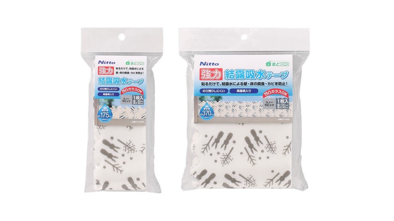 当社の「結露吸水テープ」は、吸水性の高い独自の特殊不織布を採用した、窓に貼るだけで結露により発生した水滴を吸い取るテープです。吸水した結露は自然蒸発を繰り返すため、吸水効果が持続し、シーズンを通して壁や床の腐食、カビの発生を防止します。当社は吸水量の異なるタイプを複数ラインアップしていますが、今回発売する製品は、貼るだけで部屋を彩る図柄入りで、白地のテープに、薄いグレーのウサギと雪のイラストをあしらっています。図柄はテープの表と裏に両面印刷されているため、室内はもちろん、室外から見たときも、おしゃれな雰囲気を楽しむことができます。はがれにくく、のり残りしにくい粘着剤を塗工し、型板ガラスやくもりガラスなど、凹凸ガラス※にも使用いただけます。幅60mmと120mmの2サイズ展開で、1枚当たりの吸水量は、幅60mmで約175ml、幅120mmでは約370mlです。