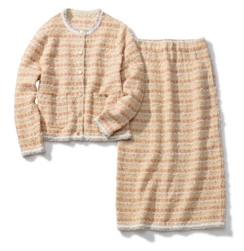 SOAVE(優美な、甘美な、柔らかな、快い)とAGE(年齢、年)を組み合わせた造語をブランド名とするソアージュ。きちんと感のあるツイード風ニットのセットアップを紹介します。