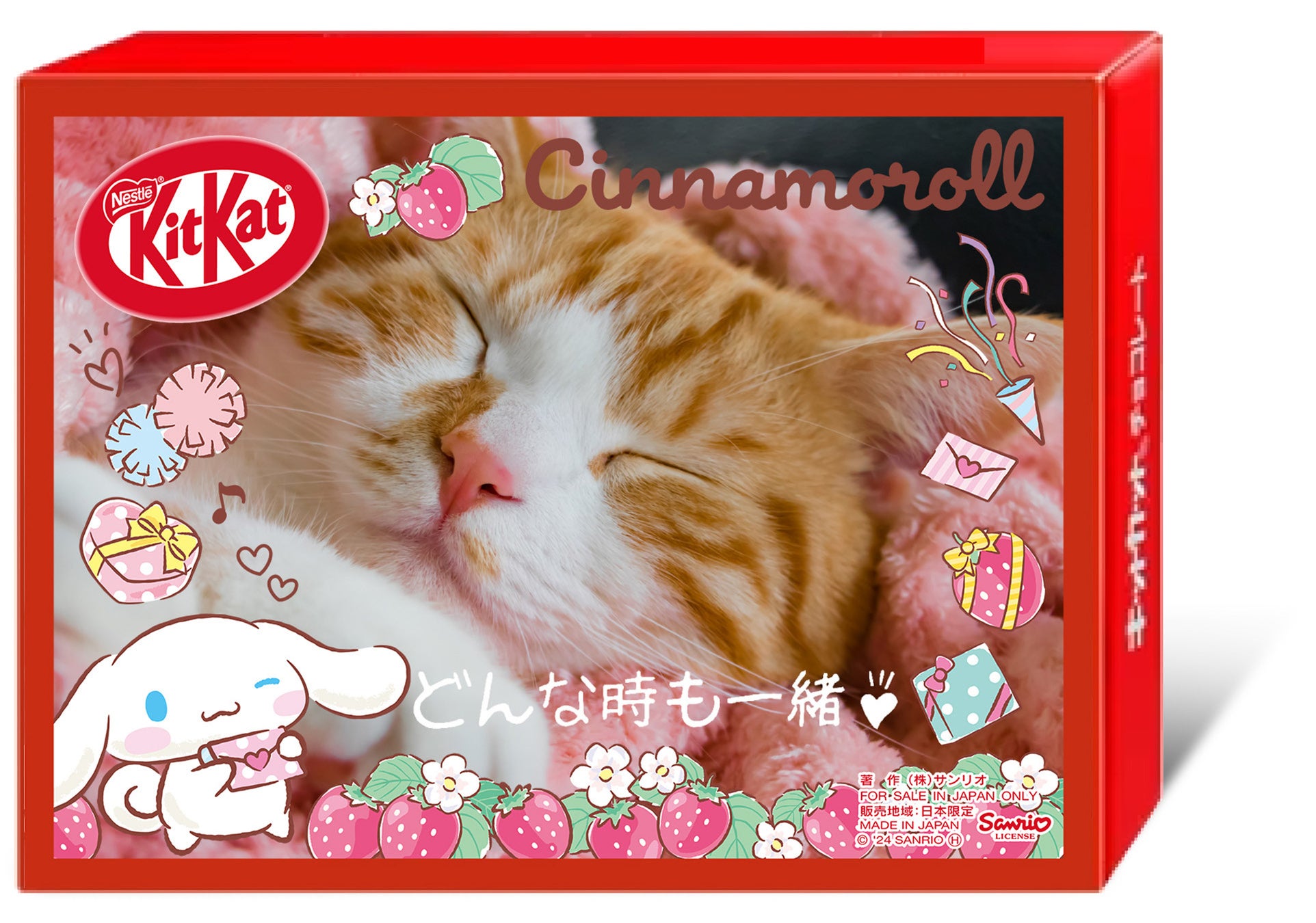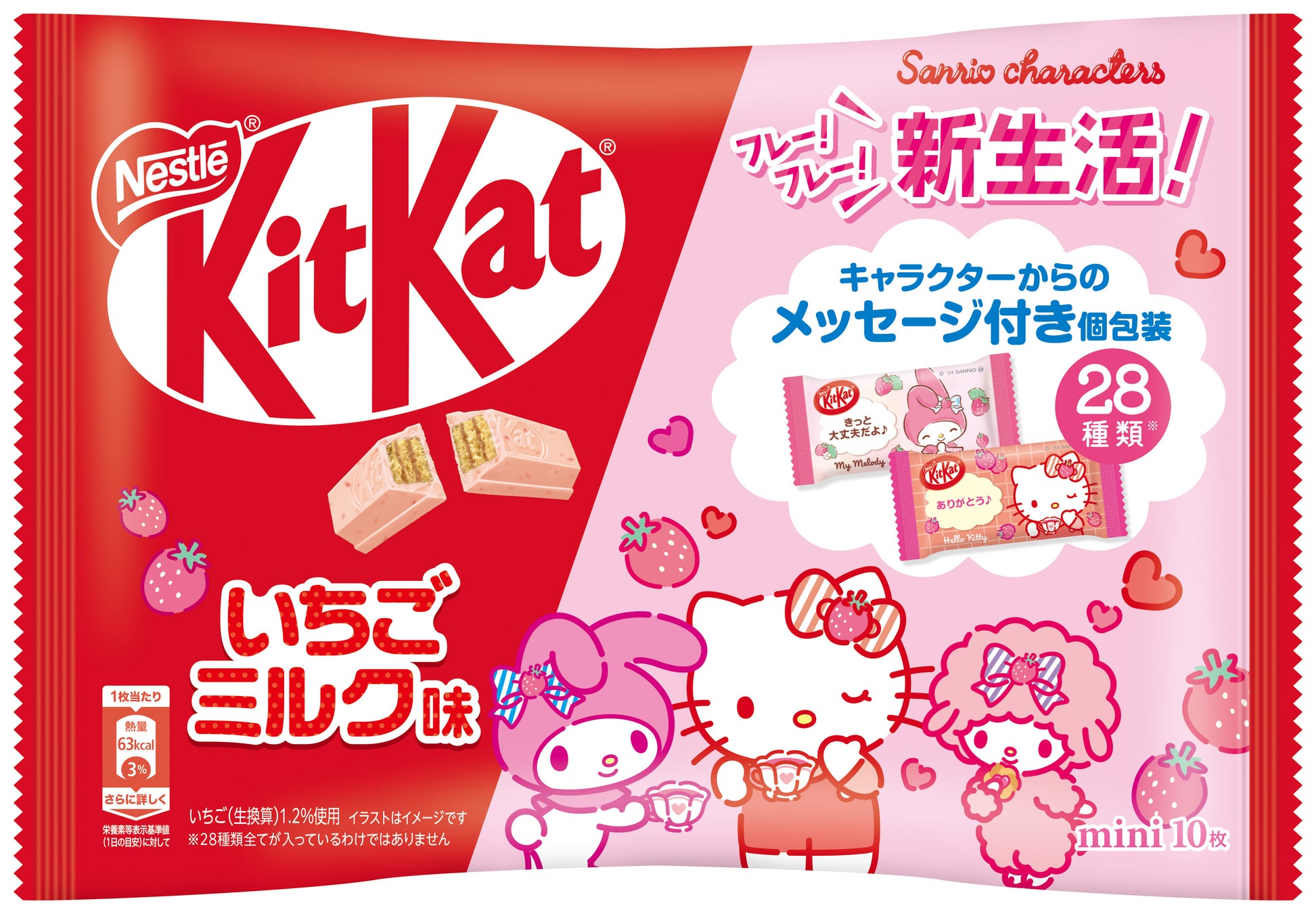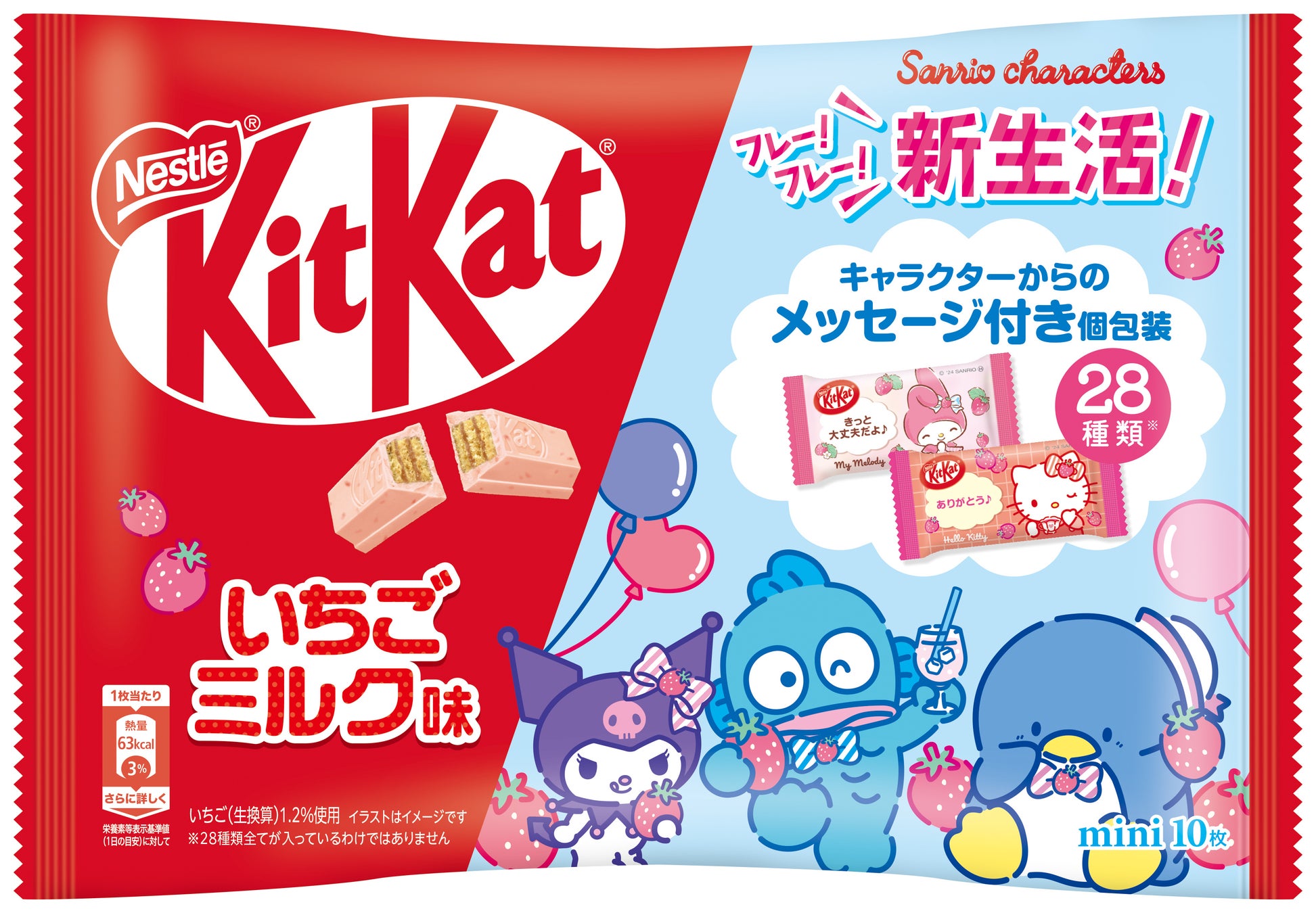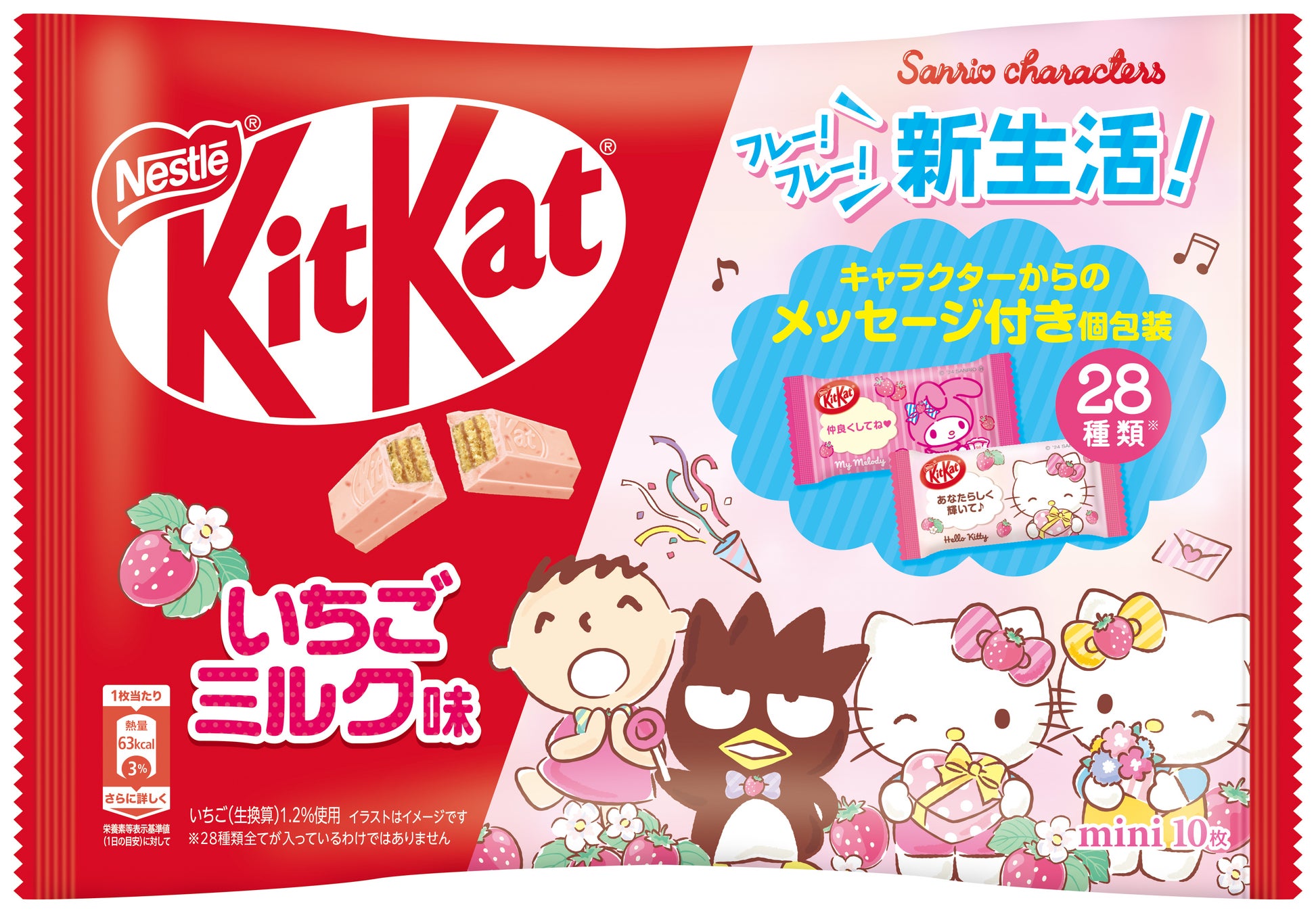 今回、”新生活応援”をテーマに、誰かに元気をもらいたい時や、友人や同僚とのちょっとした会話のきっかけ作りにおすすめの製品として、「キットカット サンリオキャラクターズ いちごミルク味」を、4月1日(月)より期間限定で、全国のスーパーマーケットやドラッグストアなどで販売します。