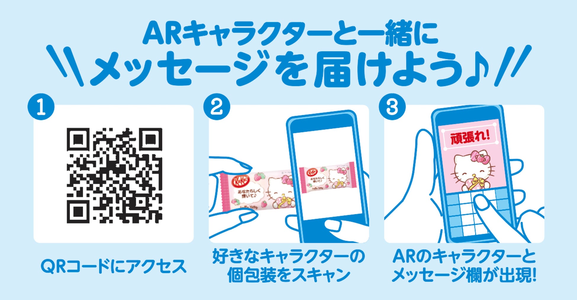 ・①「キットカット サンリオキャラクターズ いちごミルク味」に掲載のQRコードもしくは、「キットカット」ホームページより、特設ARサイトにアクセスする。