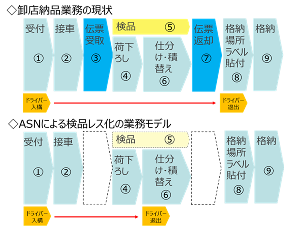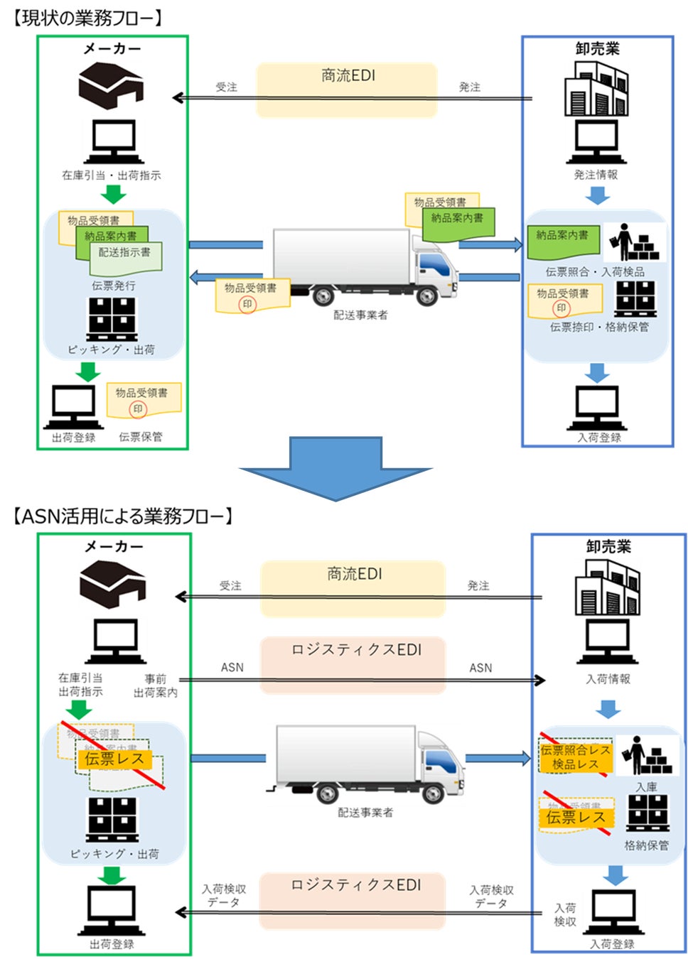 ASNを卸売業に配信することで、紙伝票の電子化(伝票レス)や、納品時の検品作業の簡素化が進み、荷受け作業の時間が短縮できることで、物流における労働生産性の向上と物流資源の効率化が実現します。