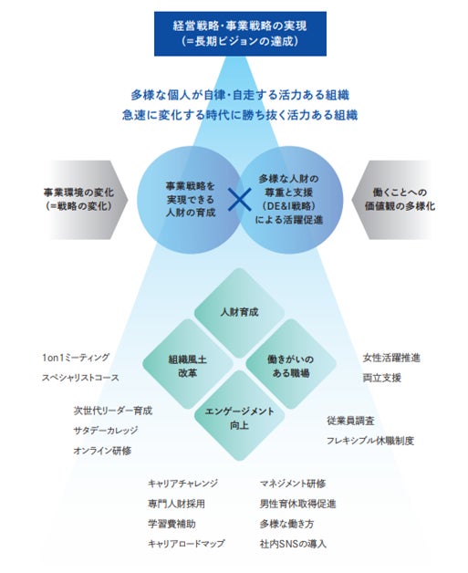 2022年度よりスタートさせた第7次中期経営計画は、長期ビジョン2030の実現を目指す最初の中期経営計画と位置付けており、「人財戦略」においては、「多様な個人が自律・自走する活力ある組織」「急速に変化する時代に勝ち抜く活力ある組織」を目指し、「人財育成」「組織風土改革」「働きがいのある職場づくり」「エンゲージメント向上」といった側面から、ハード・ソフトの両面でさまざまな取り組みを相互作用させながら展開しています。