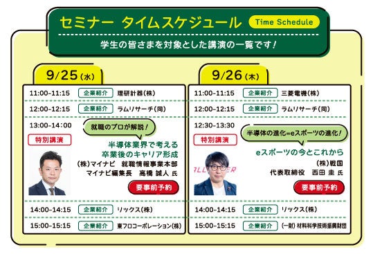 九州地区で積極的に新卒採用活動を行っている半導体業界の有力企業による「会社紹介プレゼンテーション」を行います。半導体業界でのキャリアについてなど学生向けのセミナーも実施します。