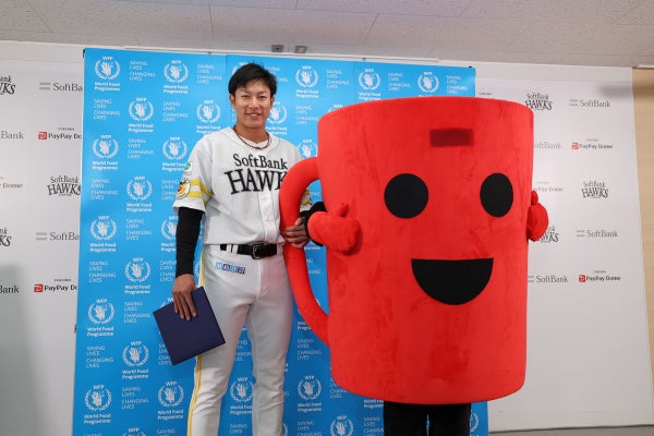 2枚目(左)柳田 悠岐 選手 (右)国連WFP協会レッドカップキャンペーンのキャラクター「レッドカップちゃん」 ©JAWFP