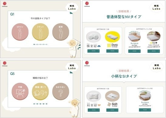 nishikawaのオリジナルキャラクター「ひつじのメルくん」がガイドとなり、6つの質問にお答えいただくだけで簡単にご自身に合った商品を判定するデジタル診断です(所要時間60秒程度)。「suyara」オリジナルレーベルの商品をはじめ、「nishikawa睡眠ラボ」「医師がすすめる健康枕」などの#おてごろ西川のまくらとマットレスを対象に、診断結果に合わせておすすめ商品をご提案します。また、睡眠のお悩みに合わせて、nishikawa公式サイトのコラム「眠りのレシピ」から解決のヒントなる情報もお届けします。