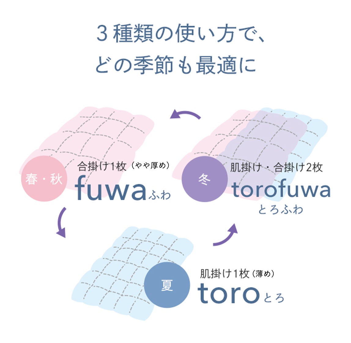 暑い夏は薄めでとろとろな肌ざわりの肌掛けふとん「toro」、春・秋はちょうどいい厚さでふんわり軽い合掛けふとん「fuwa」、寒い冬はtoro・fuwaの2枚合わせの3種類の使い方ができ、季節に応じて理想的な睡眠環境を整えます。中身の羽毛には、nishikawaの最高水準の加工を施しています。業界基準より厳しい洗浄基準によって徹底的に羽毛の汚れを取り除き、独自の「フレッシュアップ加工®」によって羽毛本来の膨らみを取り戻し、さらに良質な羽毛だけを厳選して仕上げました。ご自宅の洗濯機で洗えるのでカバーなしでご使用いただけ、自社従来品より2倍細い繊維を用いて柔軟加工をした側生地がしなやかに肌に沿い、天然ダウンのふんわり柔らかな心地よさをそのまま感じていただけます。2枚のどちらかを使わない時期は、コンパクトに丸めてすっきり収納でき、専用ランドリーバッグ付きなのも使いやすさのポイントです。