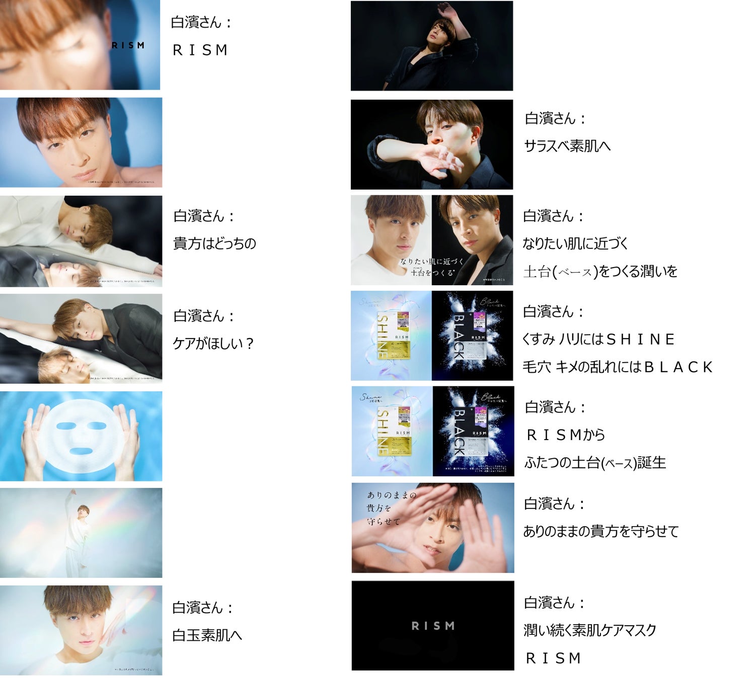 今回のプロモーションムービーは、『RISM BASE デイリーケアマスク SHINE』『RISM BASE デイリーケアマスク BLACK』商品コンセプトのもと、白と黒のビジュアルで対比された白濱亜嵐さんによる「どっちのケアが欲しい?」というセリフから始まり、『SHINE』『BLACK』それぞれの持つ潤いの特長を表現しながら、忙しい毎日での素肌ケアを応援。“理想の素肌を求める貴方をふたつのケアで守る”というメッセージを送る白濱さんの表情に注目です。