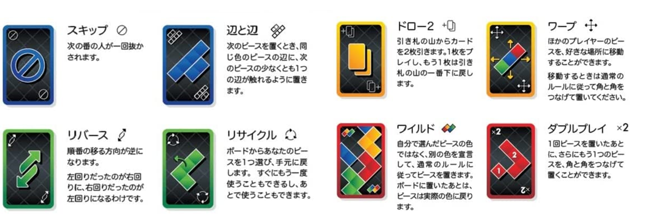 【Point】 ながらも頭を使う陣取りゲーム『ブロックス』と、カードの指示に従ってゲームを進めていく 『ウノ』の要素が組み合わさった新感覚なボードゲーム。 予測できないゲーム展開が楽しめる! |