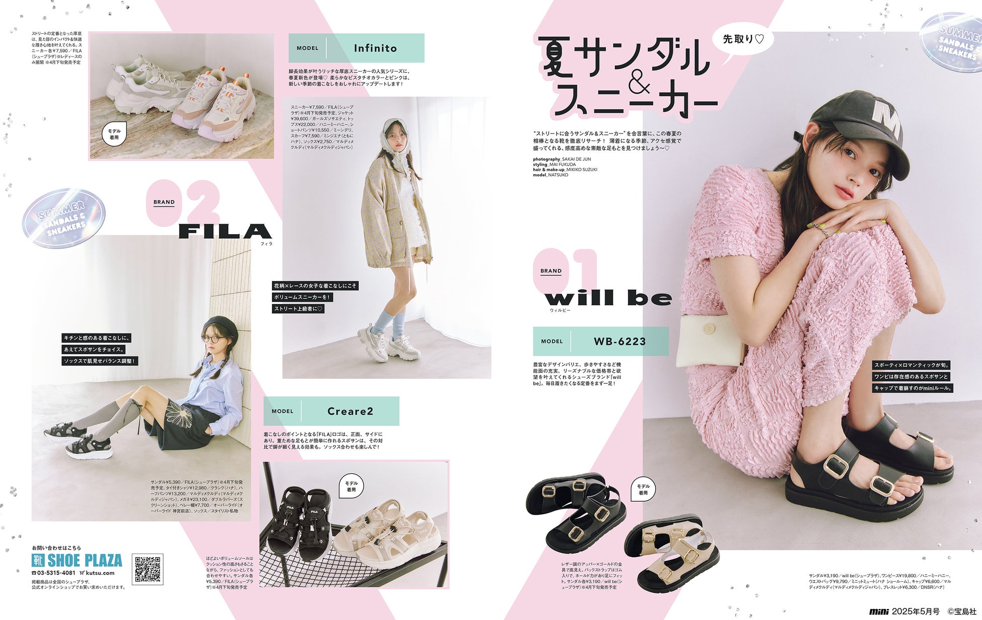 第3弾の4月12日発売の「mini」では、モデルの夏子さんが「ストリートに合うサンダル&スニーカー」を合言葉に「will be」「FILA」をminiらしさ全開で履きこなしてくれました。