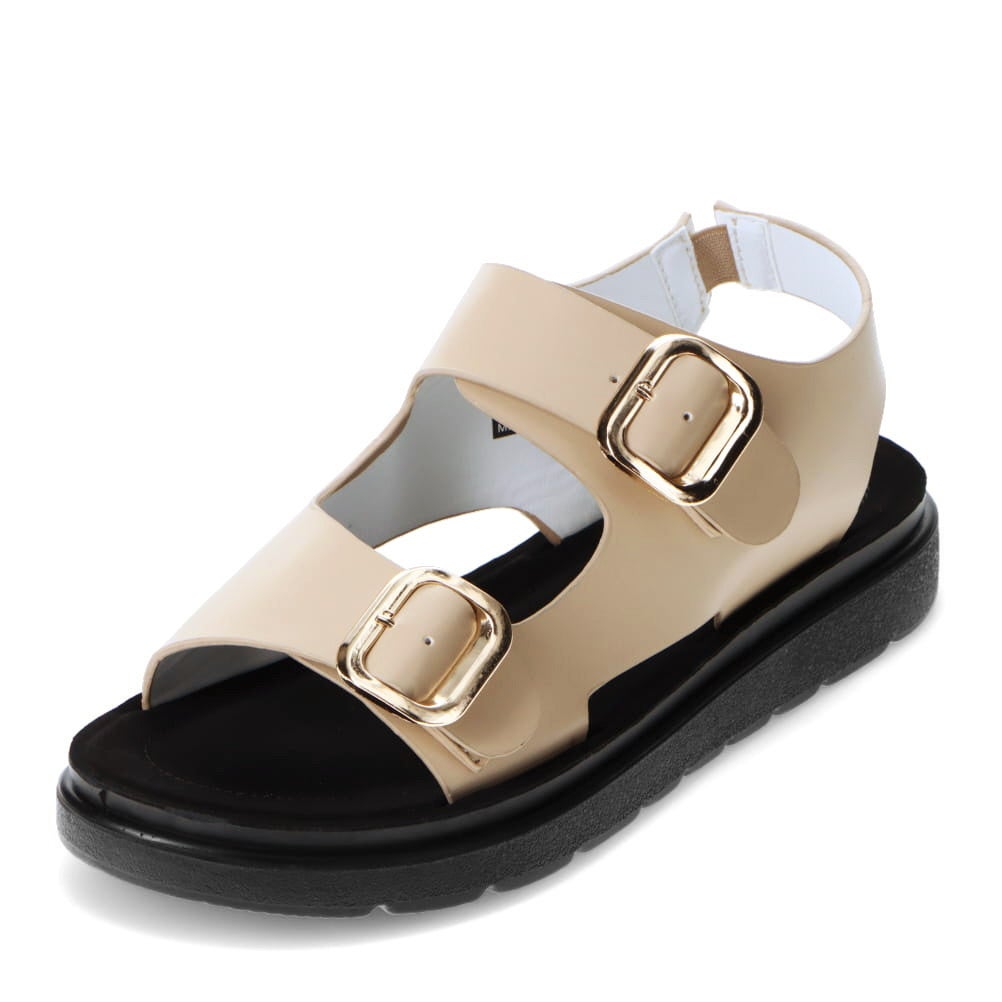 「will be」はレザー調のアッパーとゴールドカラーの金具で高級感のあるダブルベルトのサンダル。ピンクのワンピースにキャップとサンダルを合わせた甘辛MIXコーデをご紹介。