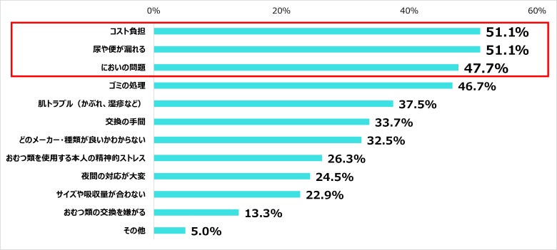 3.おむつに関しての問題・課題は1位「コスト負担(51.1%)」、同率1位「尿や便が漏れる(51.1%)」、3位「においの問題(47.7%)」という結果