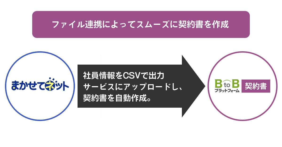 今回の連携により、「まかせてネットEX」上で作成した、氏名・生年月日等の社員情報をCSV形式で「BtoBプラットフォーム 契約書」にアップロードすることで、アルバイトの多い飲食店において手間のかかっていた雇用契約、労働条件通知書の締結業務のデジタル化が可能になります。
