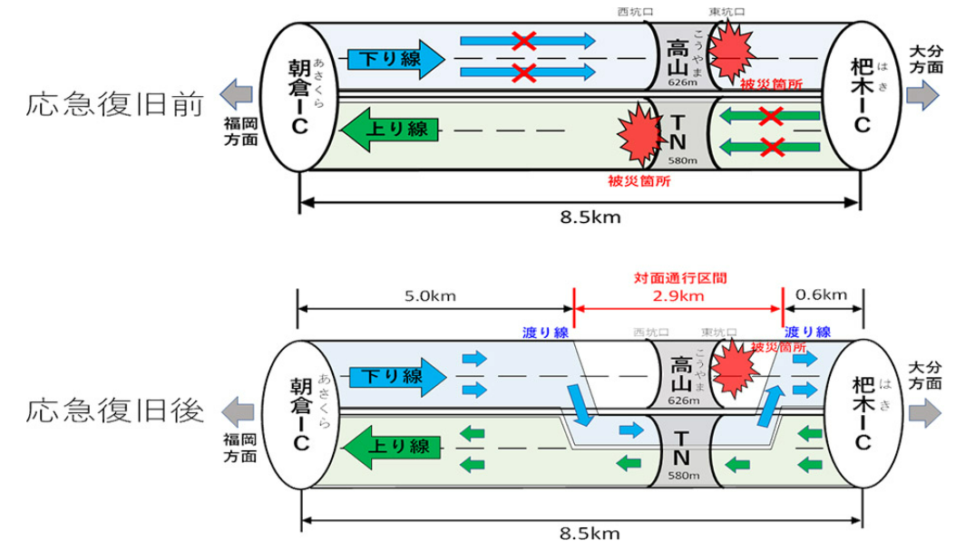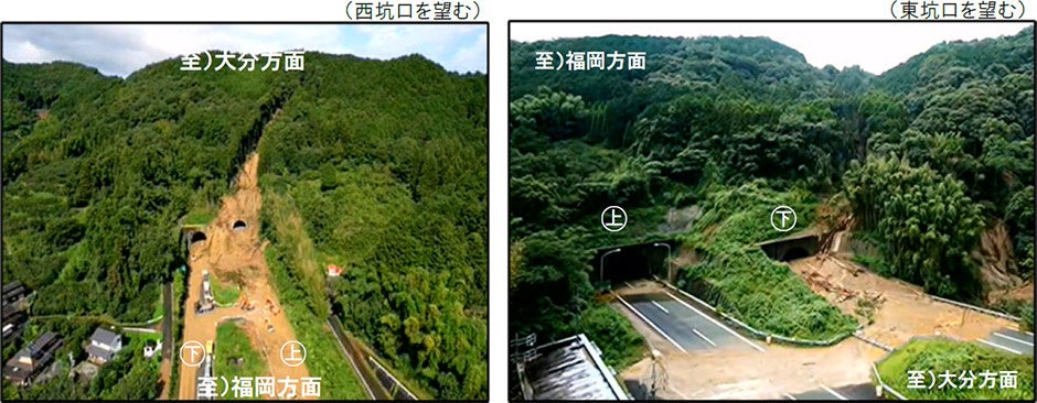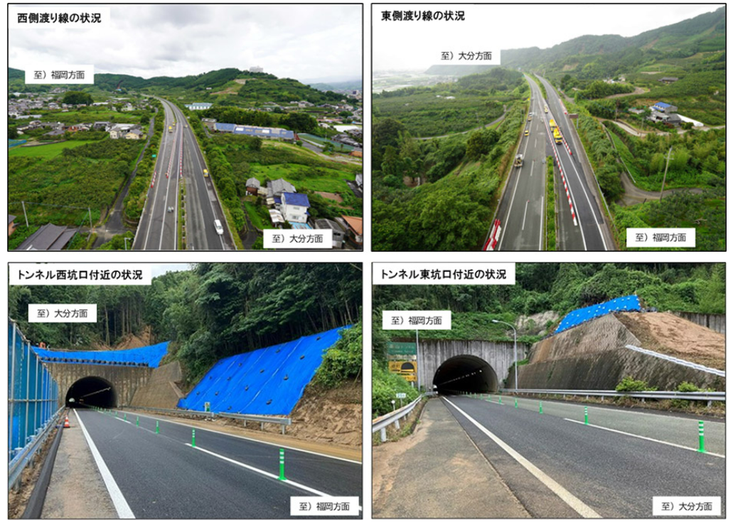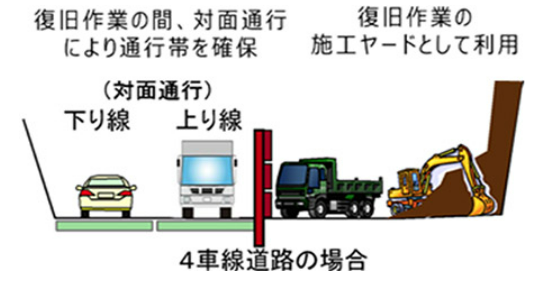 ・応急対策を実施のうえ、4車線のうち上り線を活用した対面交通により、復旧作業を行いながら、交通の確保を