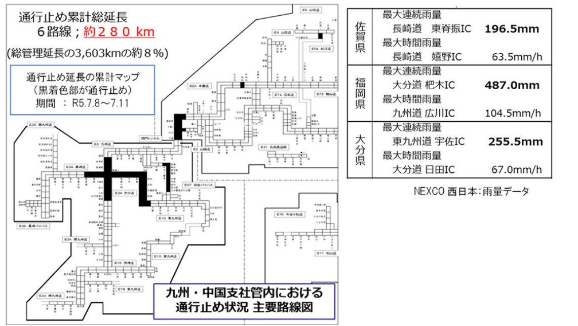 ・通行止め延長及びNEXCO気象観測局データによる降雨状況(7/7~11)