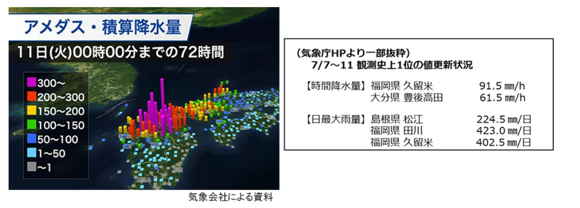 ・7月10日から梅雨前線の影響で、九州北部地方で局地的に雨雲が発達し、一部地域(福岡県、大分県)では線状