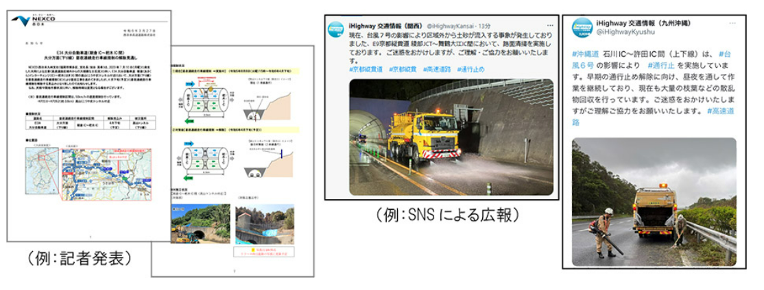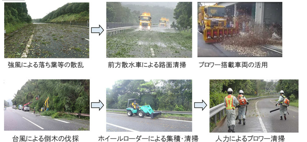 また、集中豪雨や台風等による通行規制を解除する場合は、点検や清掃等の作業を実施し、お客さまが安全に走行できるよう、適切に取り組んでまいります。