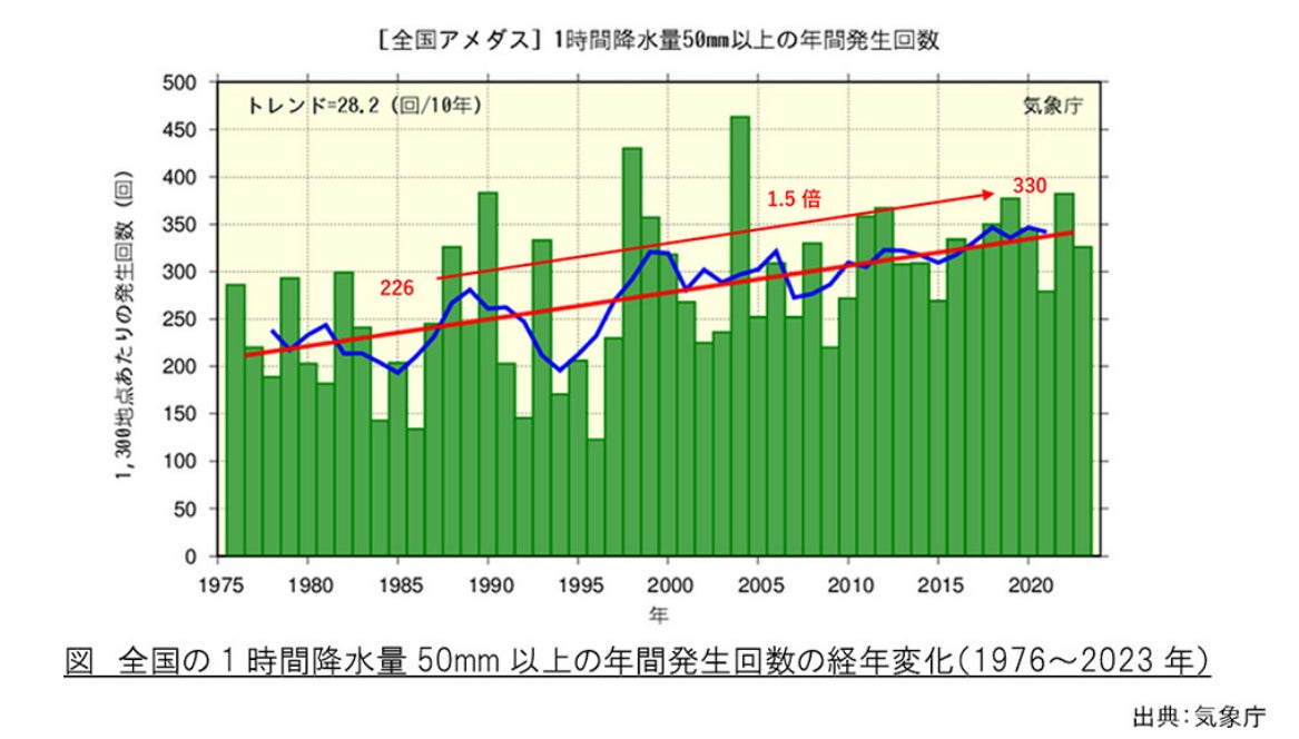 ・最近10年間(2014~2023年)における全国の1時間降水量50㎜以上の平均年間発生回数(約330回)は、統計