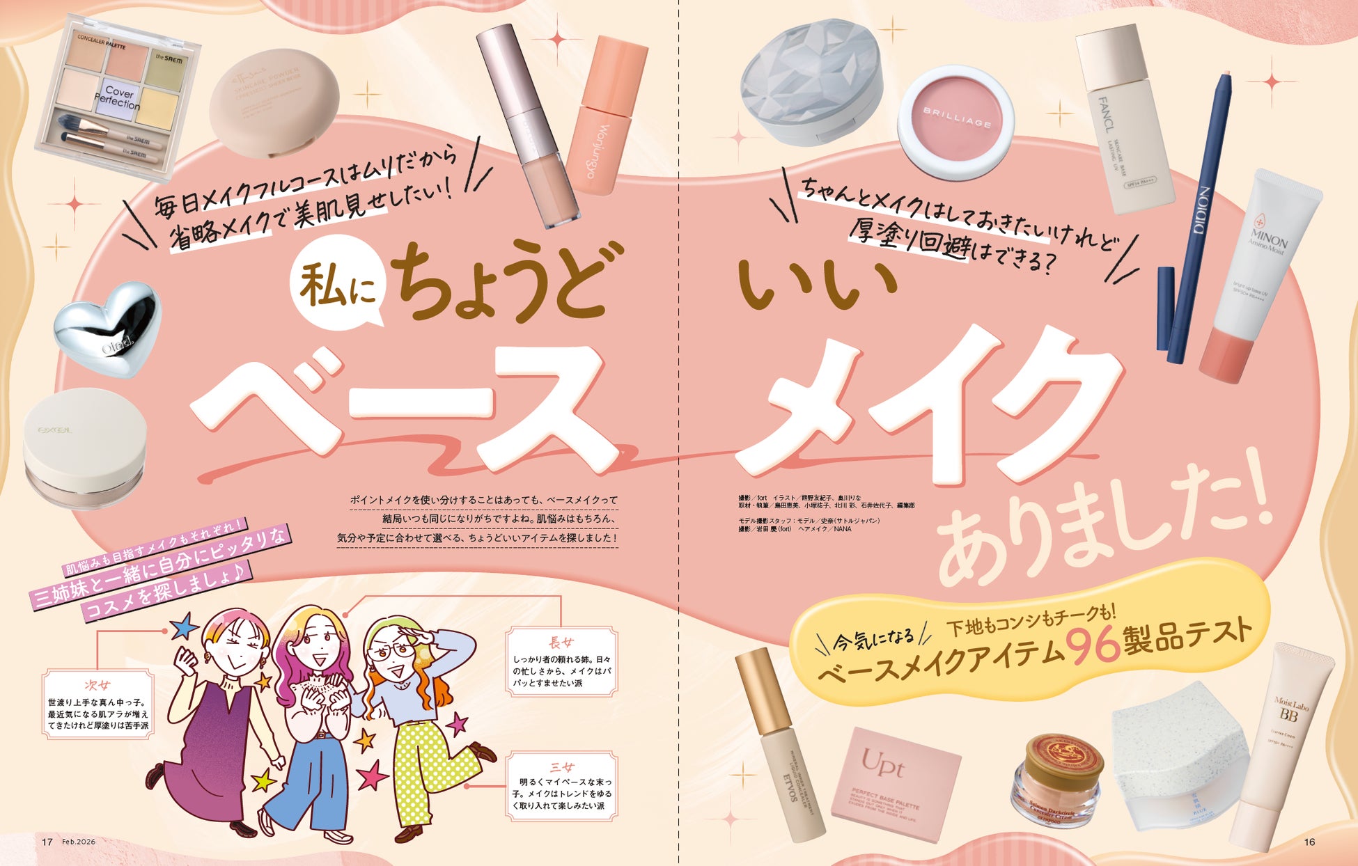 2月号は「私にちょうどいいベースメイクありました!」を総力特集! 気分やTPOでチェンジできるベースメイクのテクやアイテムを解説します。他にも、美容誌+αベスコス辛口ジャッジを発表。また、今っぽ黒マスカラや、フェイスクリームのおすすめなど、今知りたい美容情報をたっぷりとご紹介します。