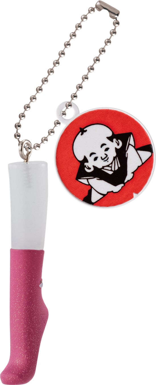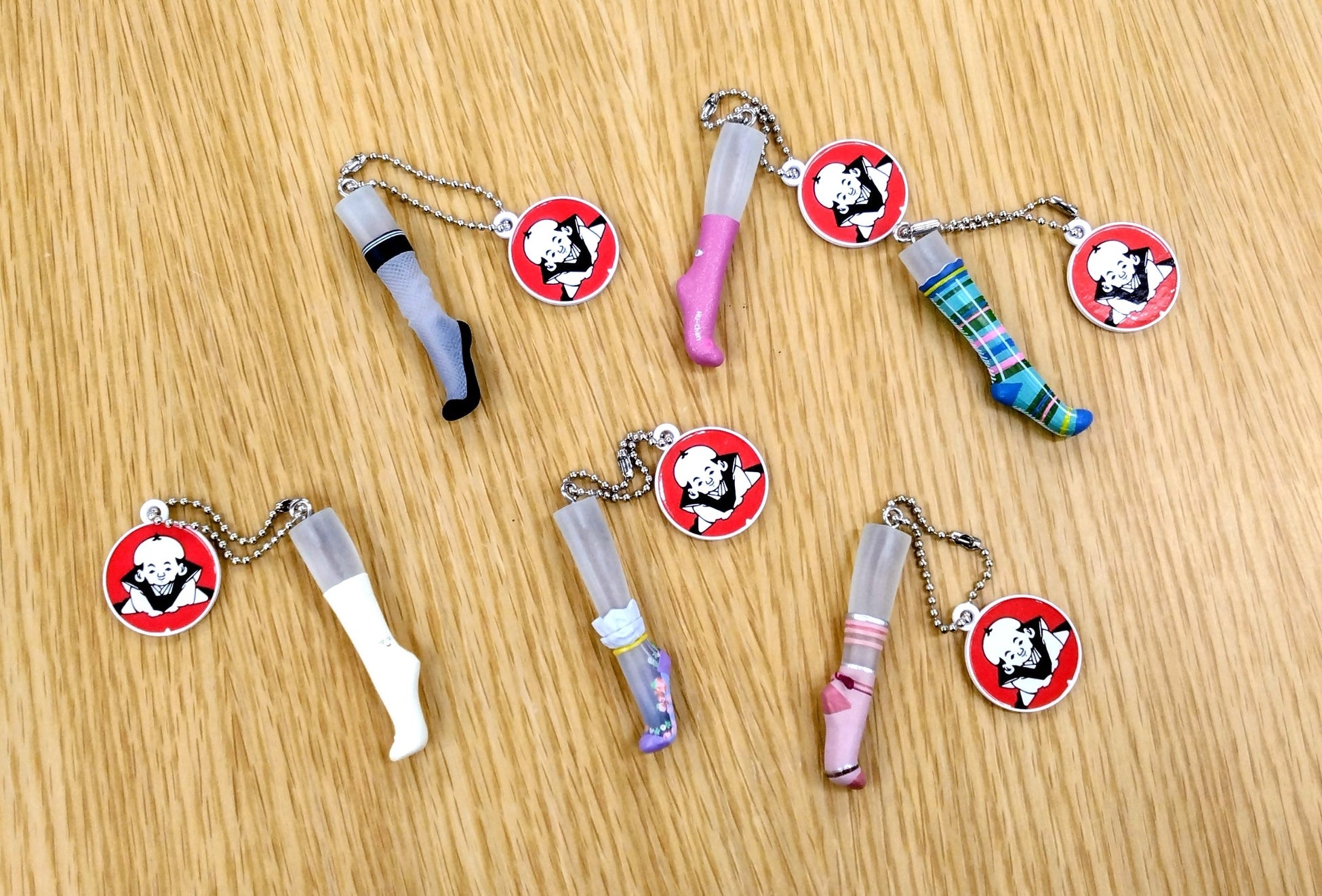 「福助 ダブルスイングフィギュア」は「.fukuske by FUKUMATSU」の特徴でもある繊細かつ複雑な編みや技巧を見事に再現したもので、実際に着用しているかのような自然なたるみやしわ感までもが表現され、生地の風合いまでもが伝わる仕上がりとなっており、それぞれ当社のCIマークでもある福助キャラクターが描かれた丸型プレートが組み合わされたダブルチャームです。デザインは全6種類。シースルー、ラメ、フリルやリボン、刺繍モチーフといったファッション感度の高いデザイン靴下を約1/8のサイズで表現しています。