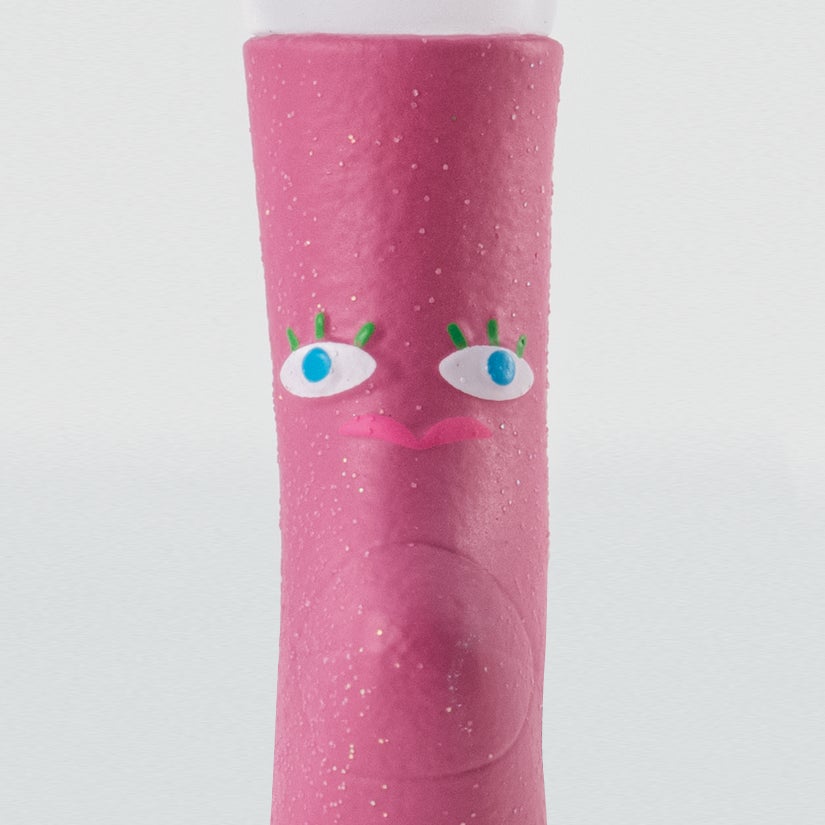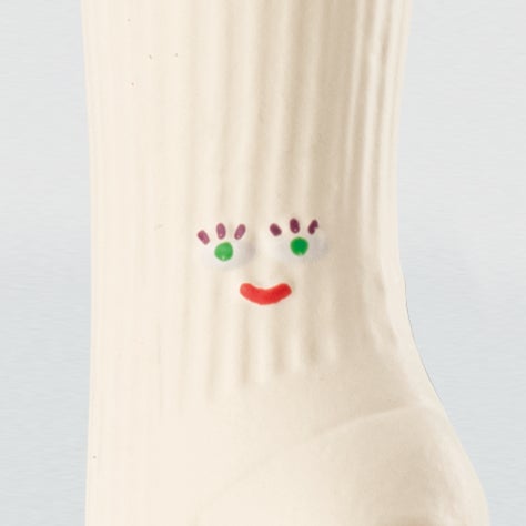 「.fukuske by FUKUMATSU」のモチーフに使われる〝ふーちゃん〟がバック面にデザインされたレギュラー丈ソックス。着用時はかかと上に顔が出ます。1本1本立ち上がったまつ毛が大きな目を一層魅力的に見せています。足の甲にはお茶目なキスマークのデザインもあしらわれています。生地はキラキラのラメ糸の引きそろえで、眩い光を反射します。