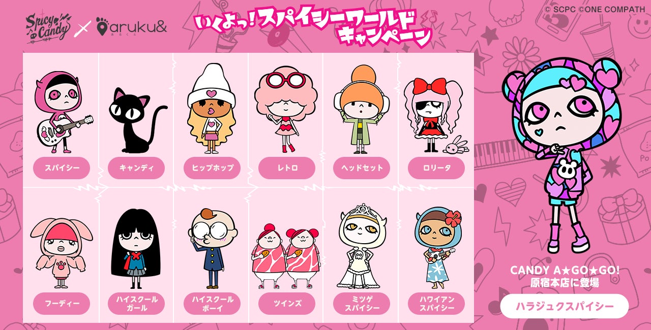 アプリ内に住民キャラクターとしてスパイシーたちが登場します。全国にランダムに出現するキャラクターとキャンペーン期間中に「CANDY A☆GO☆GO! 原宿本店」に出現する「ハラジュクスパイシー」がイベントを盛り上げます。