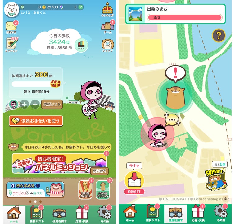 2016年11月より、株式会社ONE COMPATH(当時、株式会社マピオン)が運営している、「歩くことが楽しくなる」仕掛けが満載のウォーキングアプリです。アプリ内に登場する様々な住民キャラクターに話しかけると依頼が出され、クリアすると、地域名産品などが当たるプレゼントキャンペーンに応募できます。また、aruku&上で様々なキャンペーンが実施できる「aruku& for キャンペーン」という企業向けサービスも展開しています。自社のキャラクターを地図上の住民として掲載したり、自社製品を賞品に設定したりすることで、ブランド認知促進に活用できます。翌月継続率80%、1日起動回数平均16回(※23年4月29日~5月25日平均)と毎日アクティブに使われるヘルスケアアプリのため、ゲーム要素やプレゼントなど「歩く事が楽しくなる」仕掛けにより、健康意識の高い層から健康無関心層にも歩く習慣づけとともに商品認知を促すことができます。