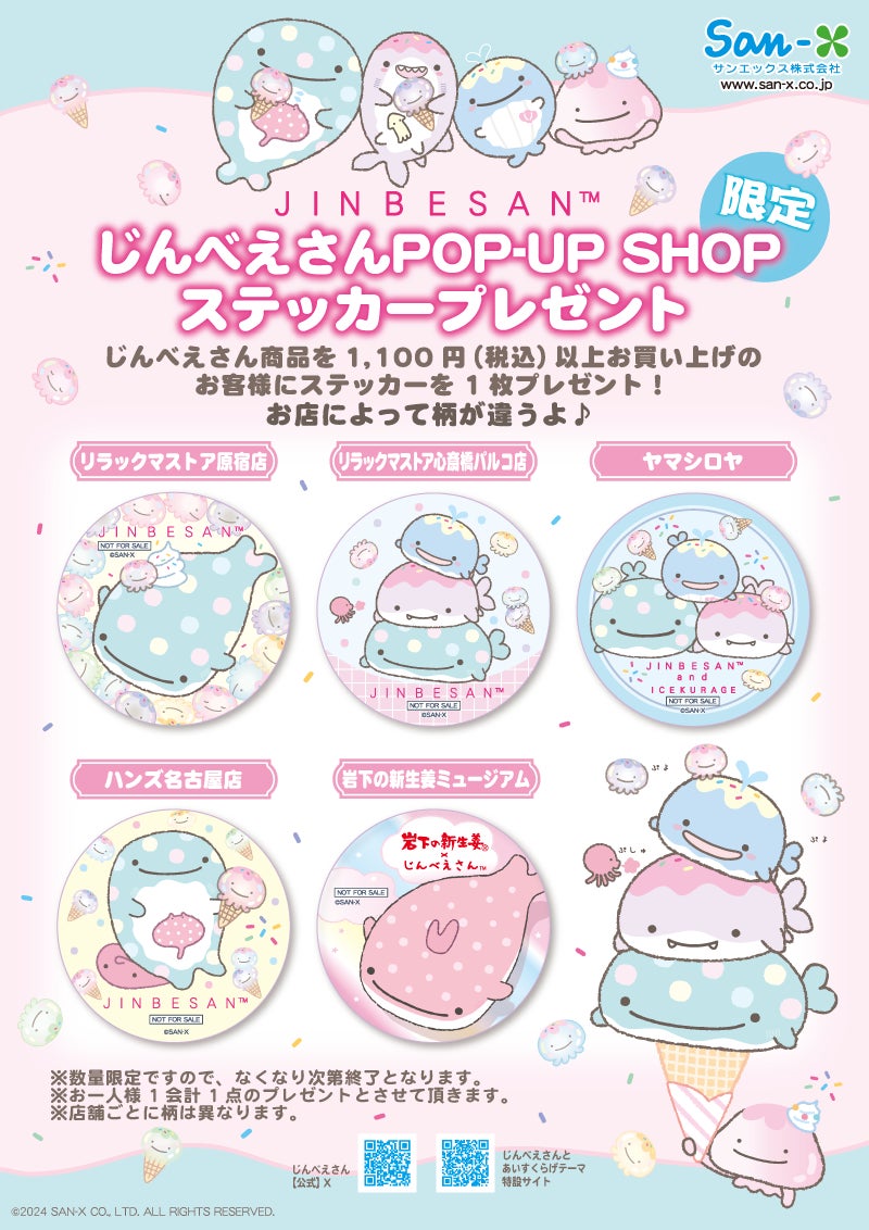 3月下旬より登場する新テーマ『じんべえさんとあいすくらげ』の発売を記念し、ヤマシロヤ・リラックマストア 原宿店・ハンズ 名古屋店8F・リラックマストア心斎橋パルコ店・岩下の新生姜ミュージアムで実施され、店舗ごとに特別なノベルティステッカーを用意します。