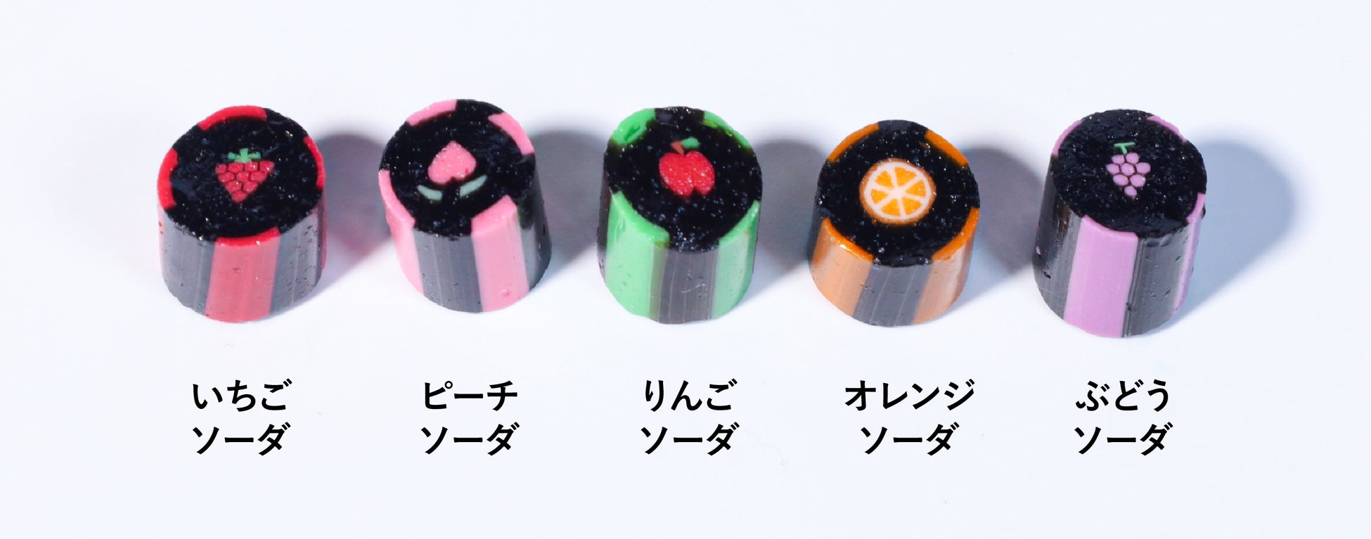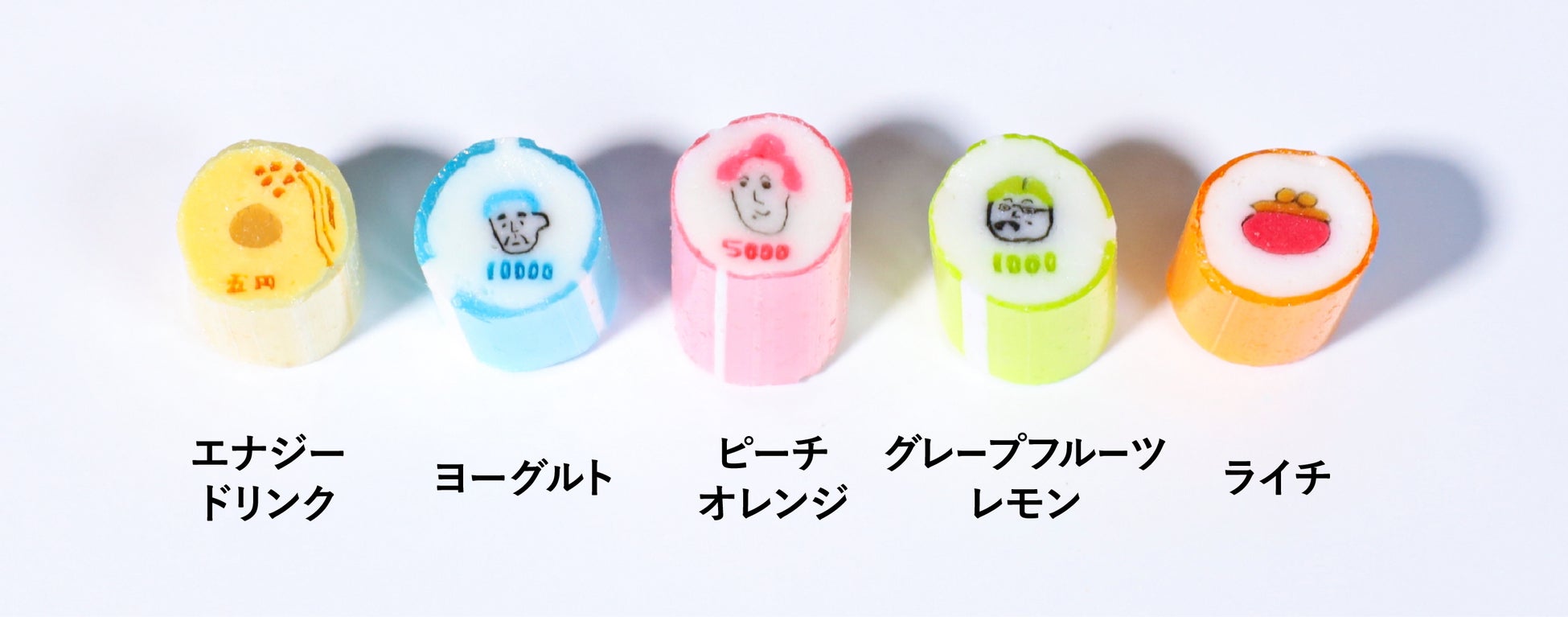 2024年7月から発行が開始された新紙幣や、馴染みのある硬貨を絵柄にしたキャンディです。ゆるいながらも特徴を捉えた「渋沢栄一」「津田梅子」「 北里柴三郎」3名の絵柄は、髪型や数字の造形に職人技が光ります。「エナジードリンク」「ピーチオレンジ」等、全て限定フレーバーで揃えました。